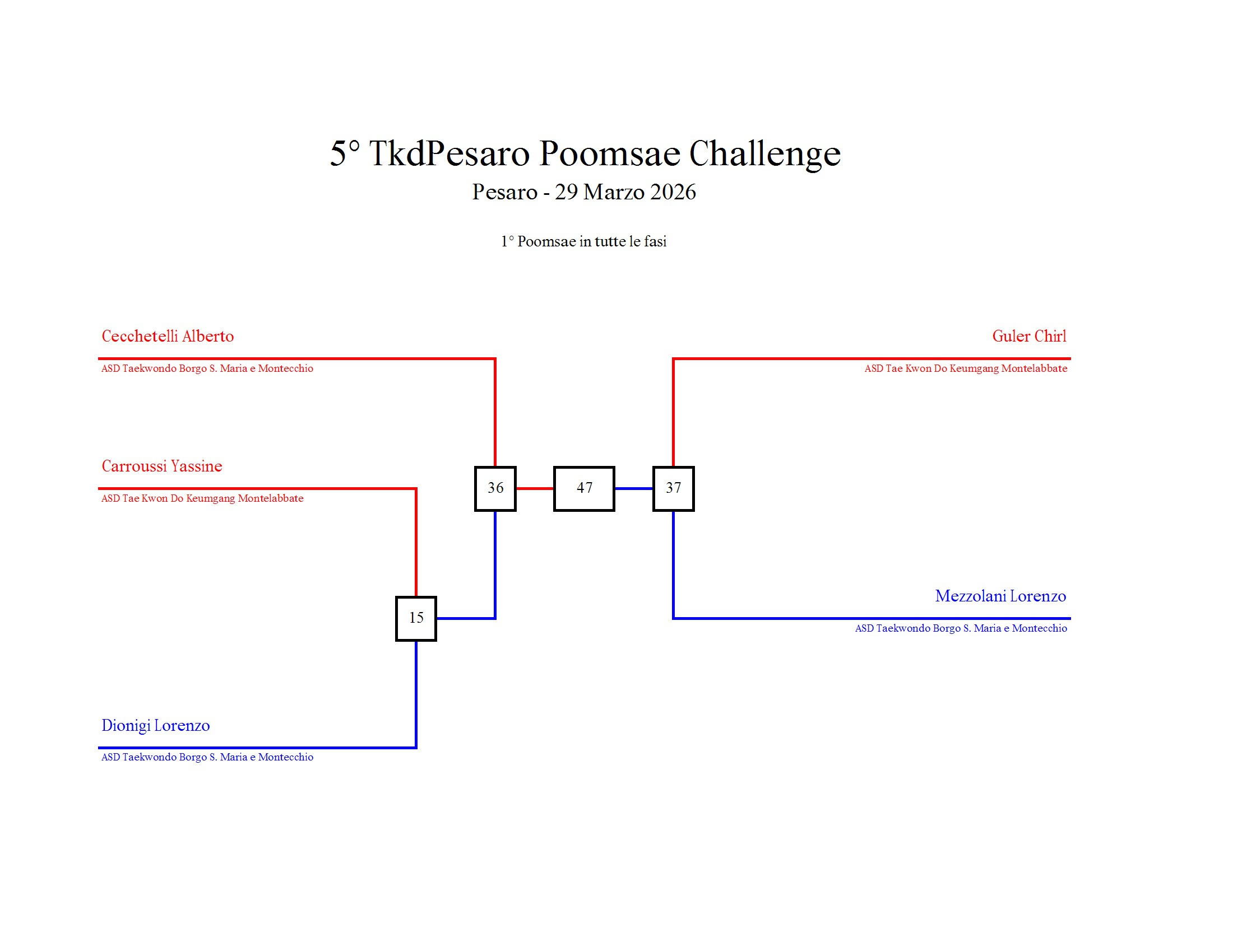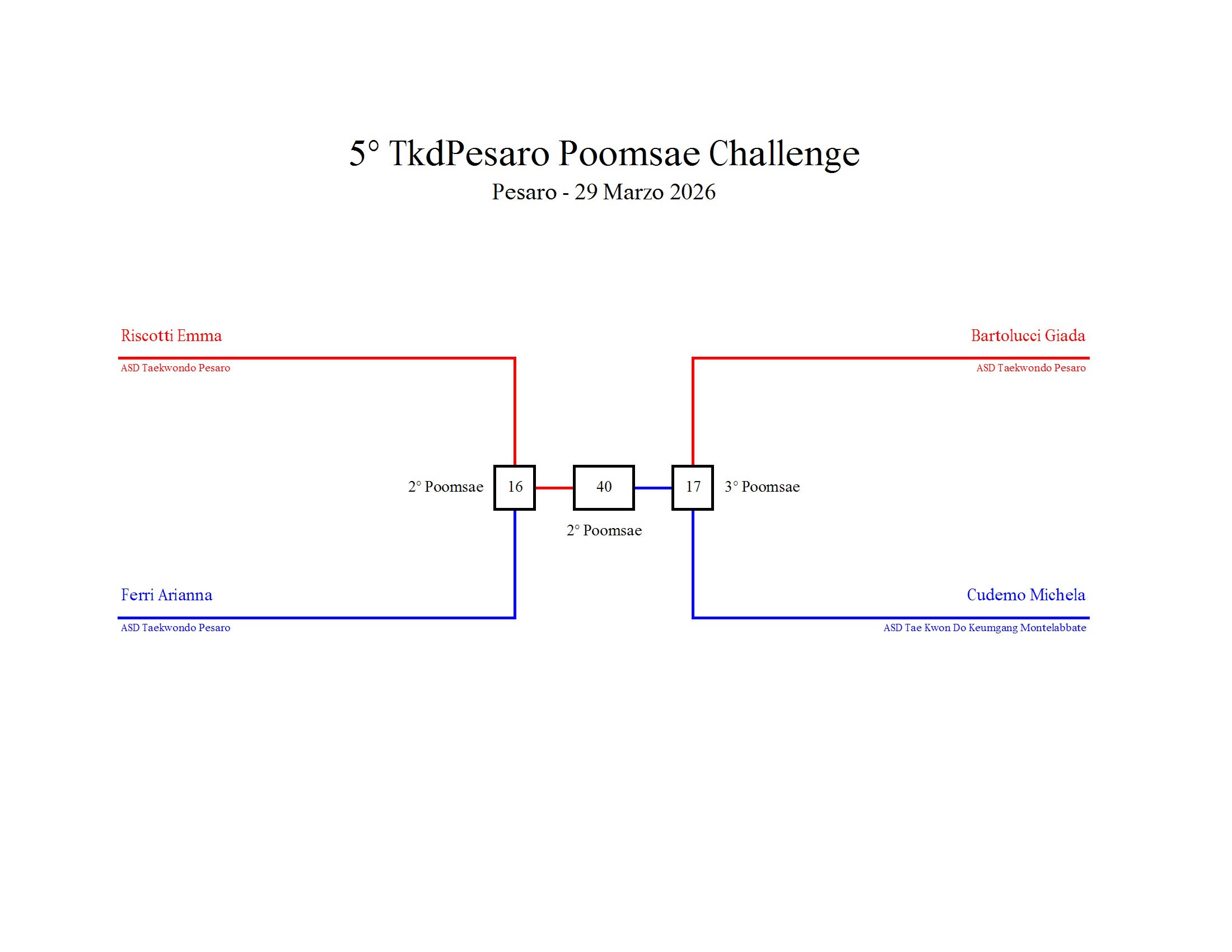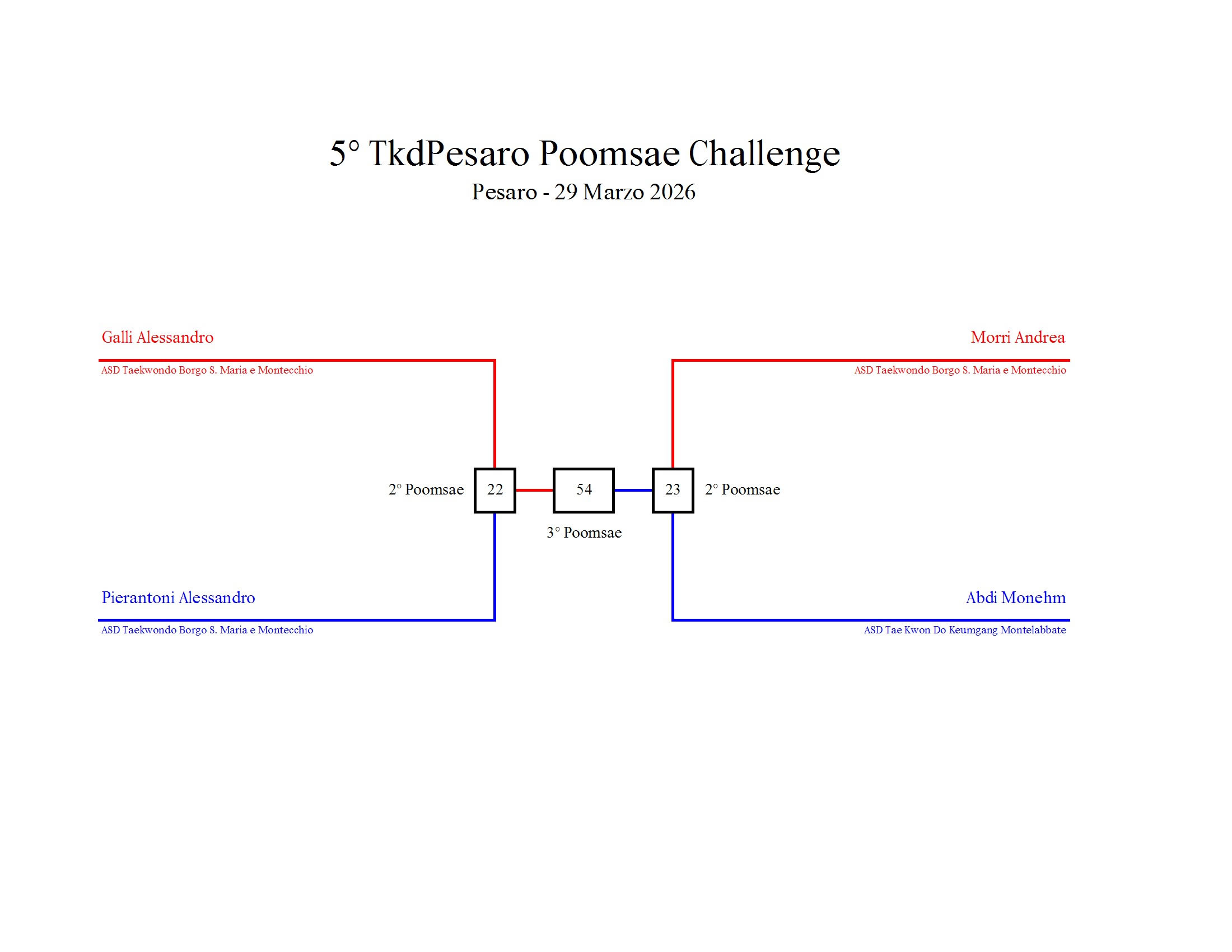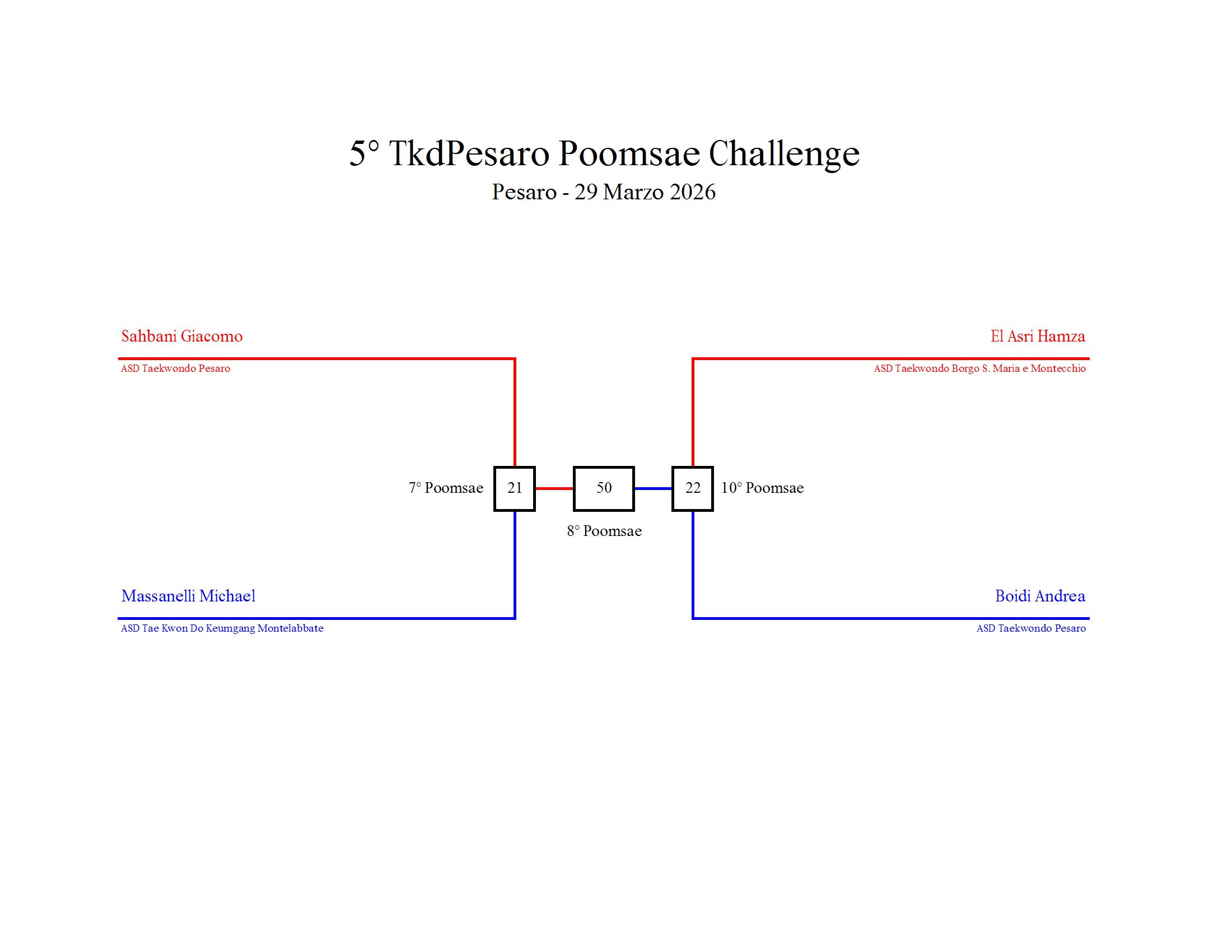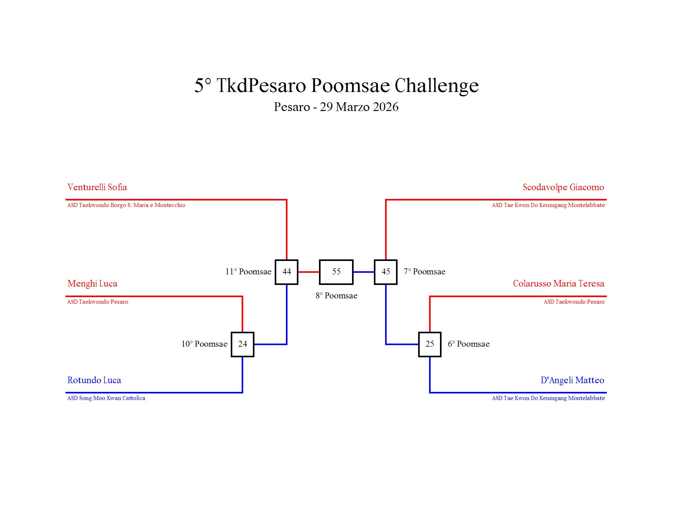 - La sfida sarà diretta e in contemporanea, quindi si esibirà l’allievo 1 assieme all’allievo 2 eseguendo la stessa poomsae in contemporanea, chi vince sfiderà il vincitore dell’altro round; si eseguirà una forma per ogni round
