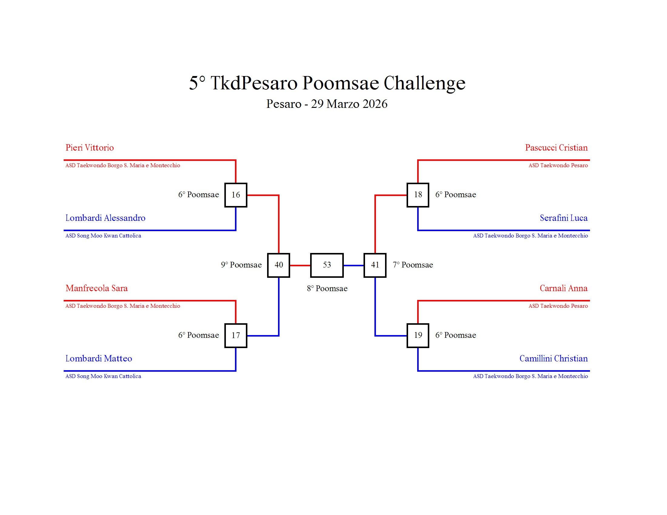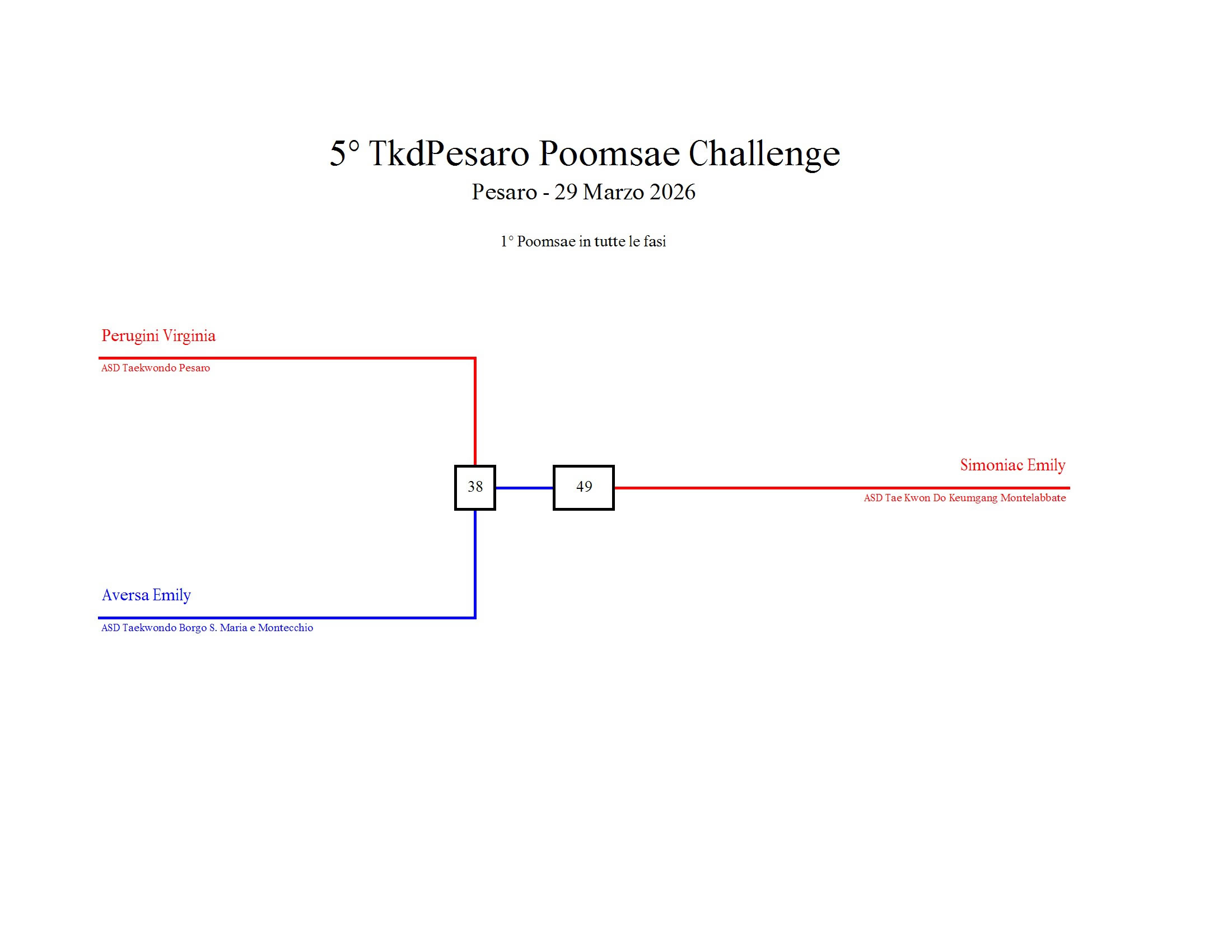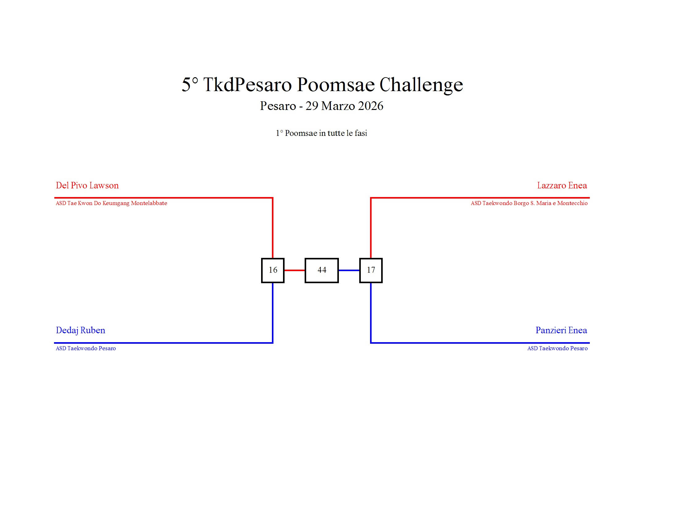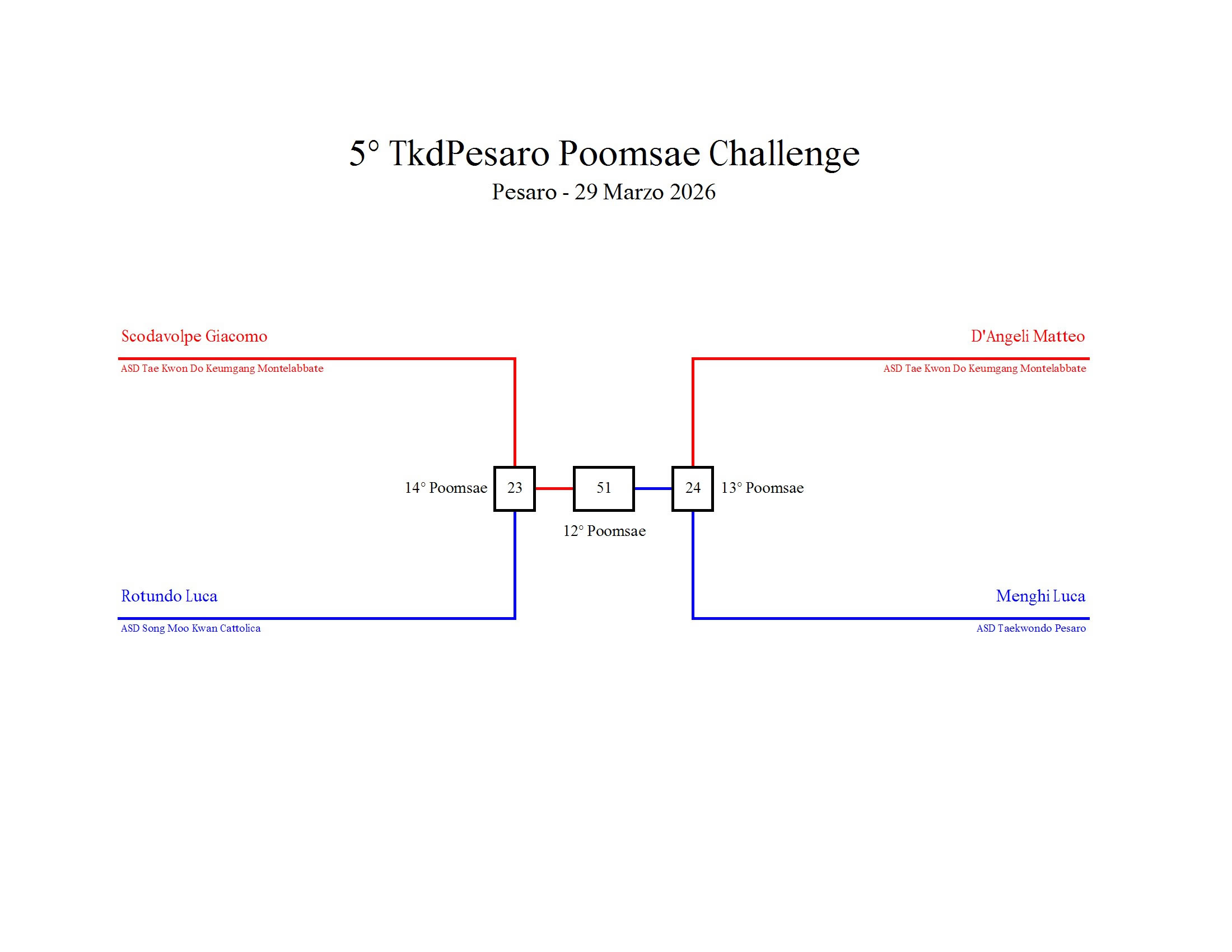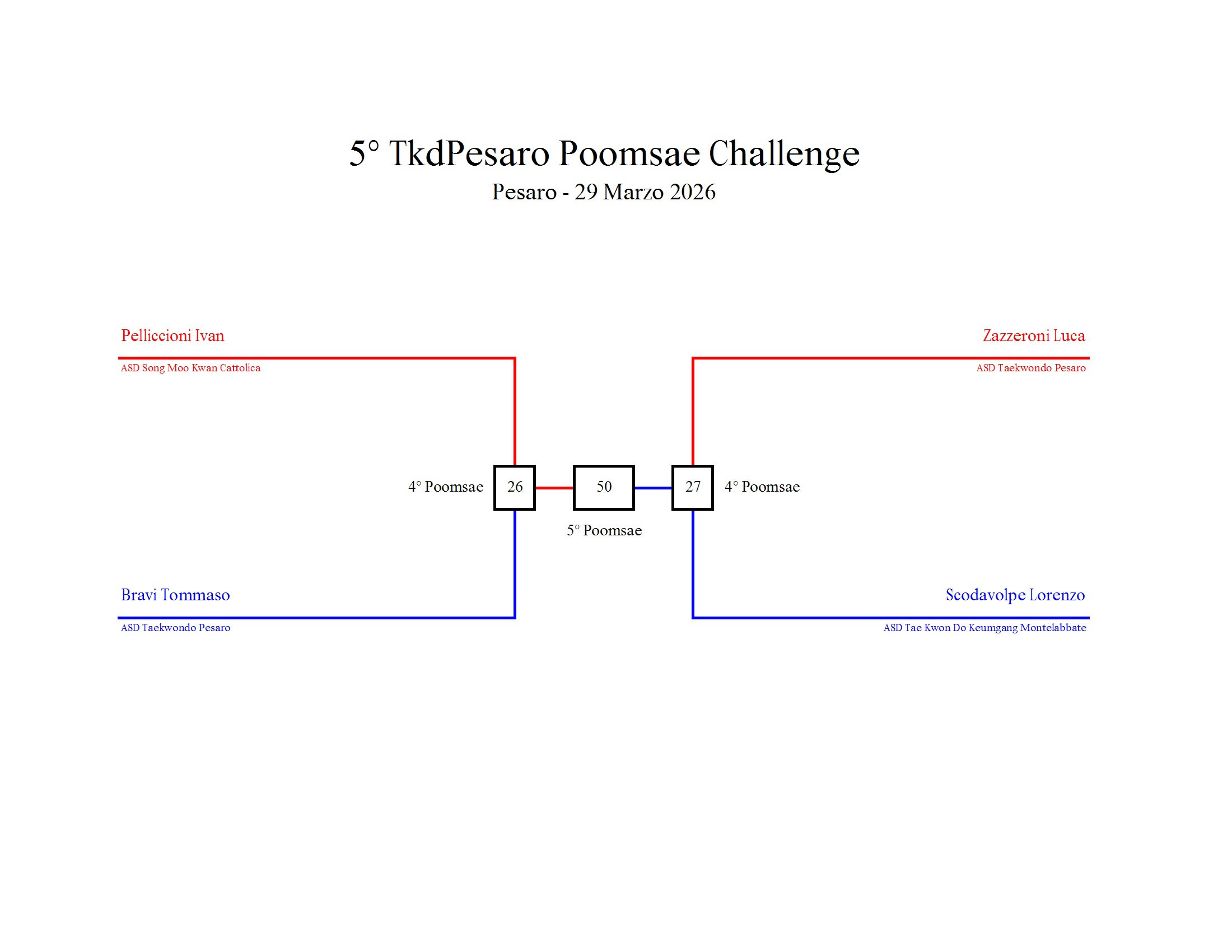 - La sfida sarà diretta e in contemporanea, quindi si esibirà l’allievo 1 assieme all’allievo 2 eseguendo la stessa poomsae in contemporanea, chi vince sfiderà il vincitore dell’altro round; si eseguirà una forma per ogni round