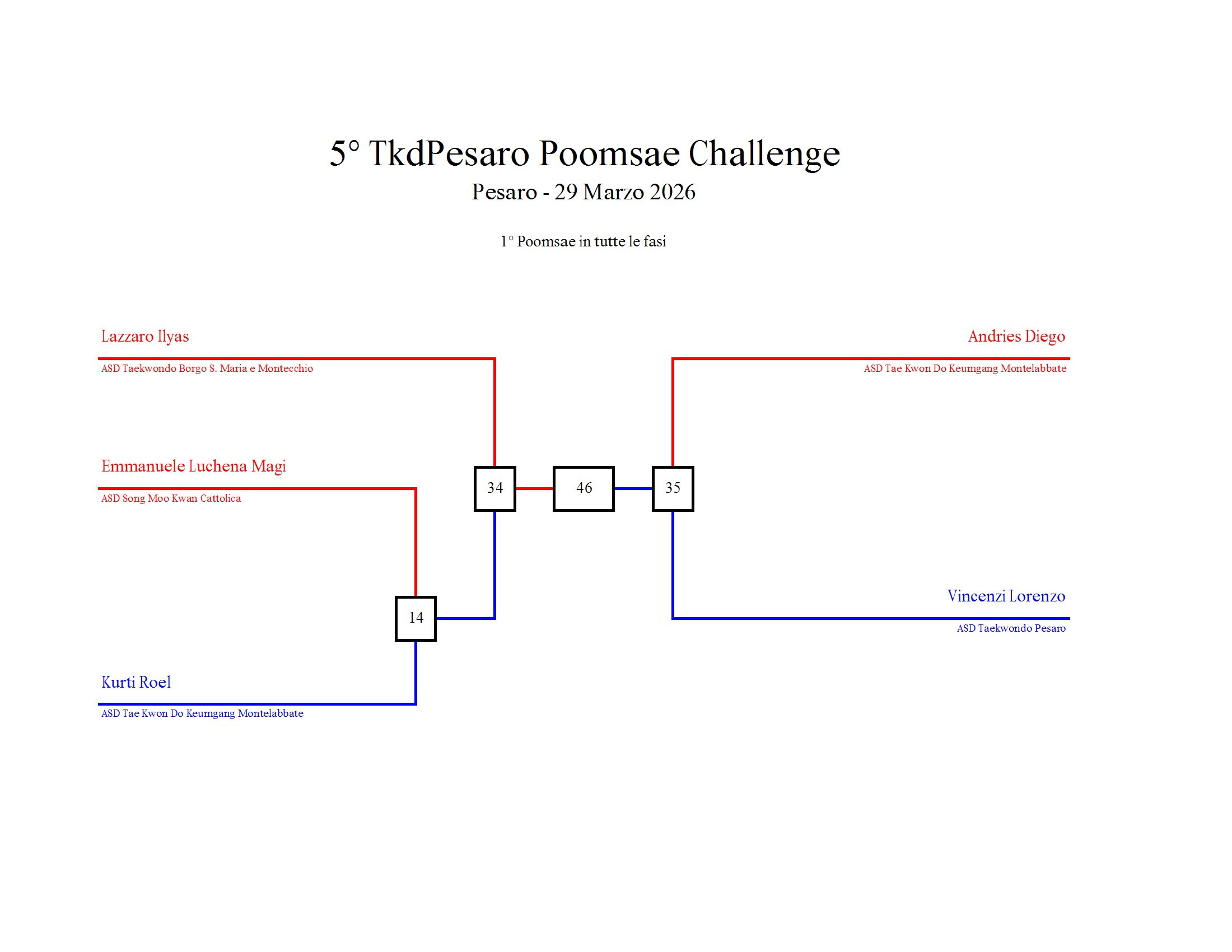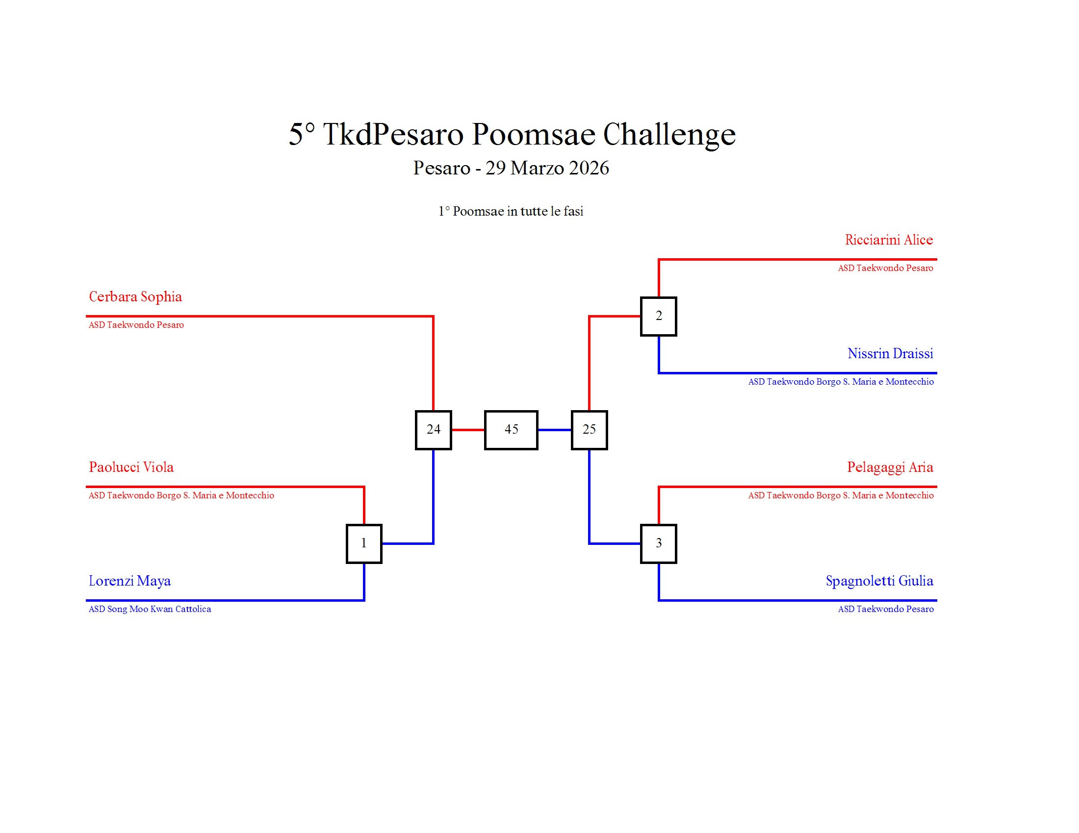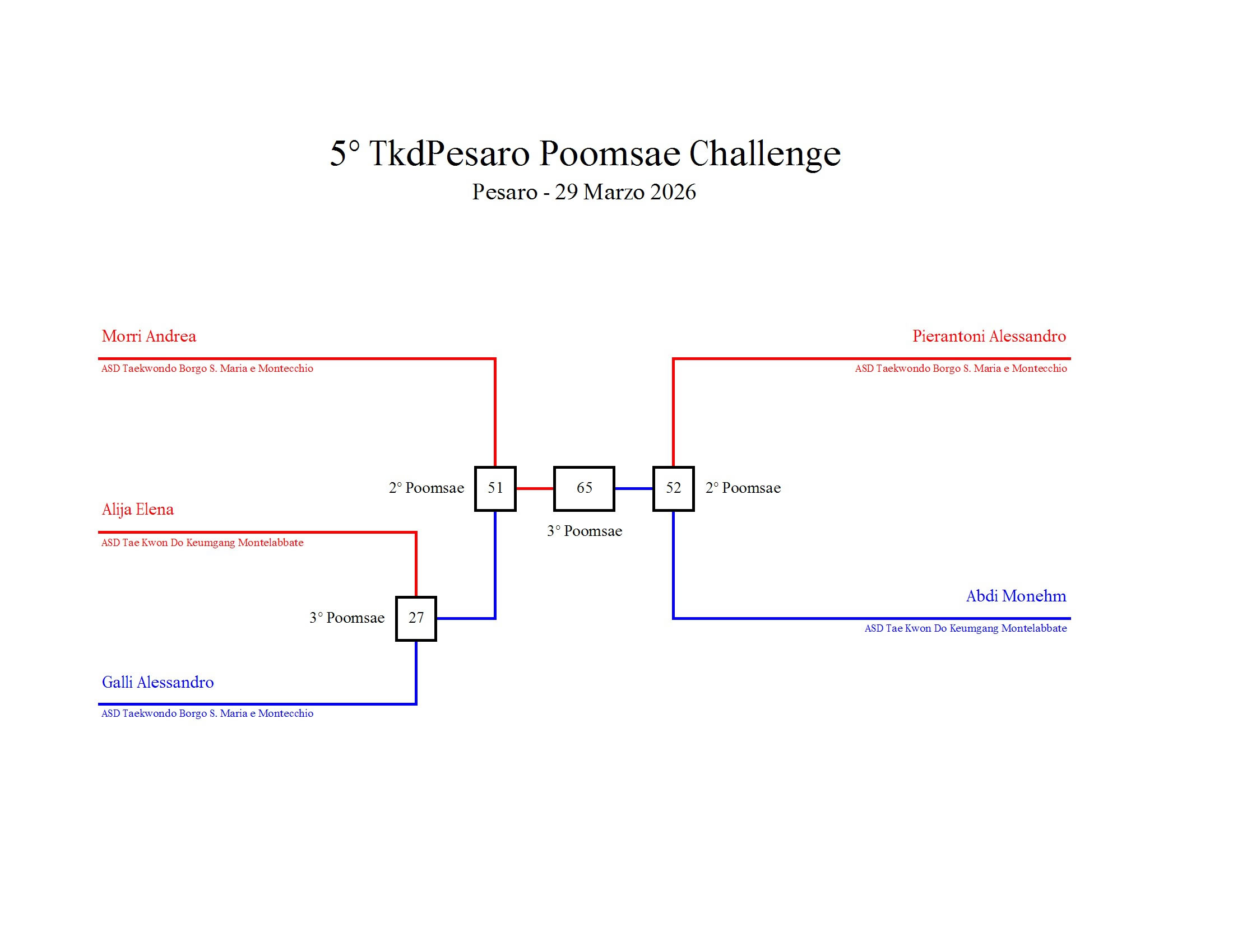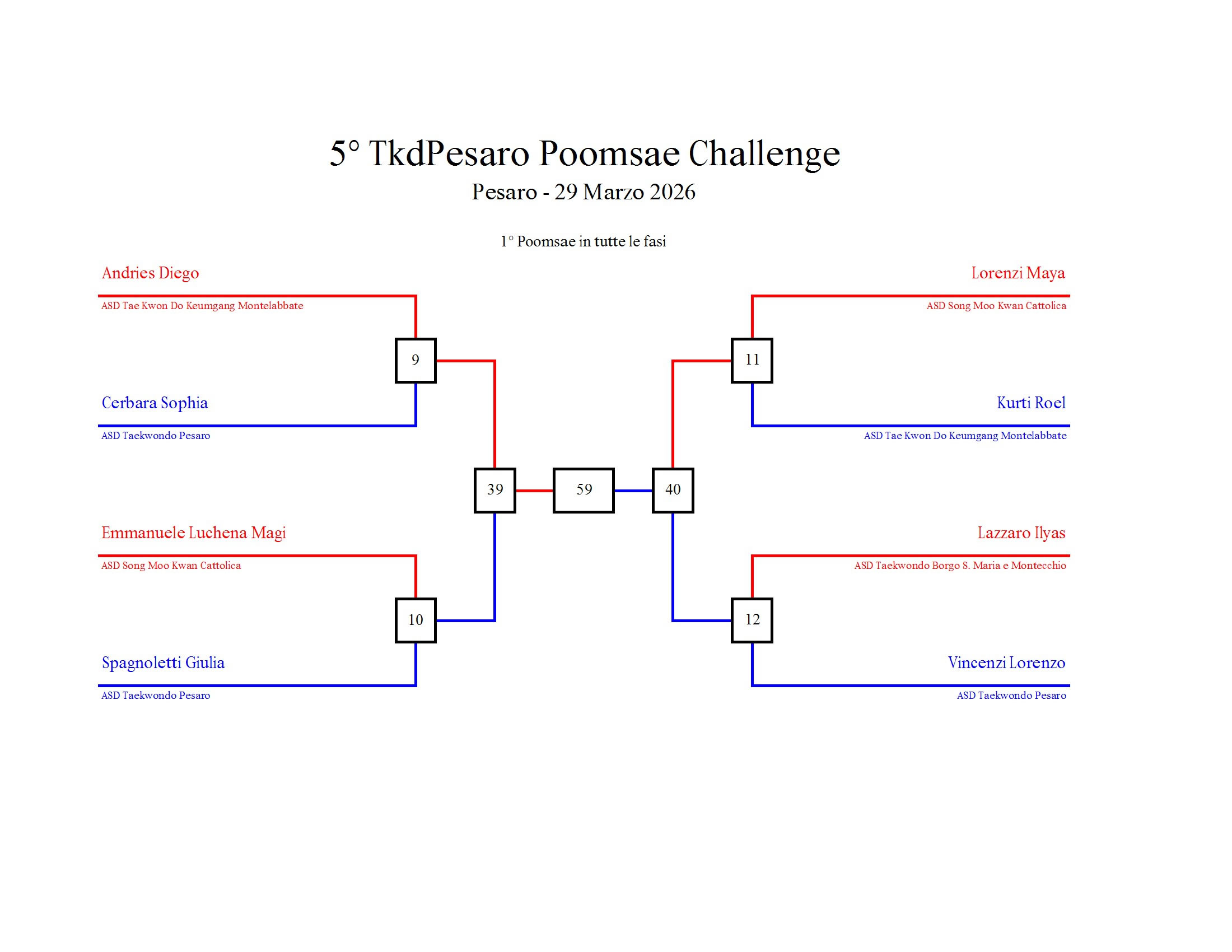 - La sfida sarà diretta e in contemporanea, quindi si esibirà l’allievo 1 assieme all’allievo 2 eseguendo la stessa poomsae in contemporanea, chi vince sfiderà il vincitore dell’altro round; si eseguirà una forma per ogni round