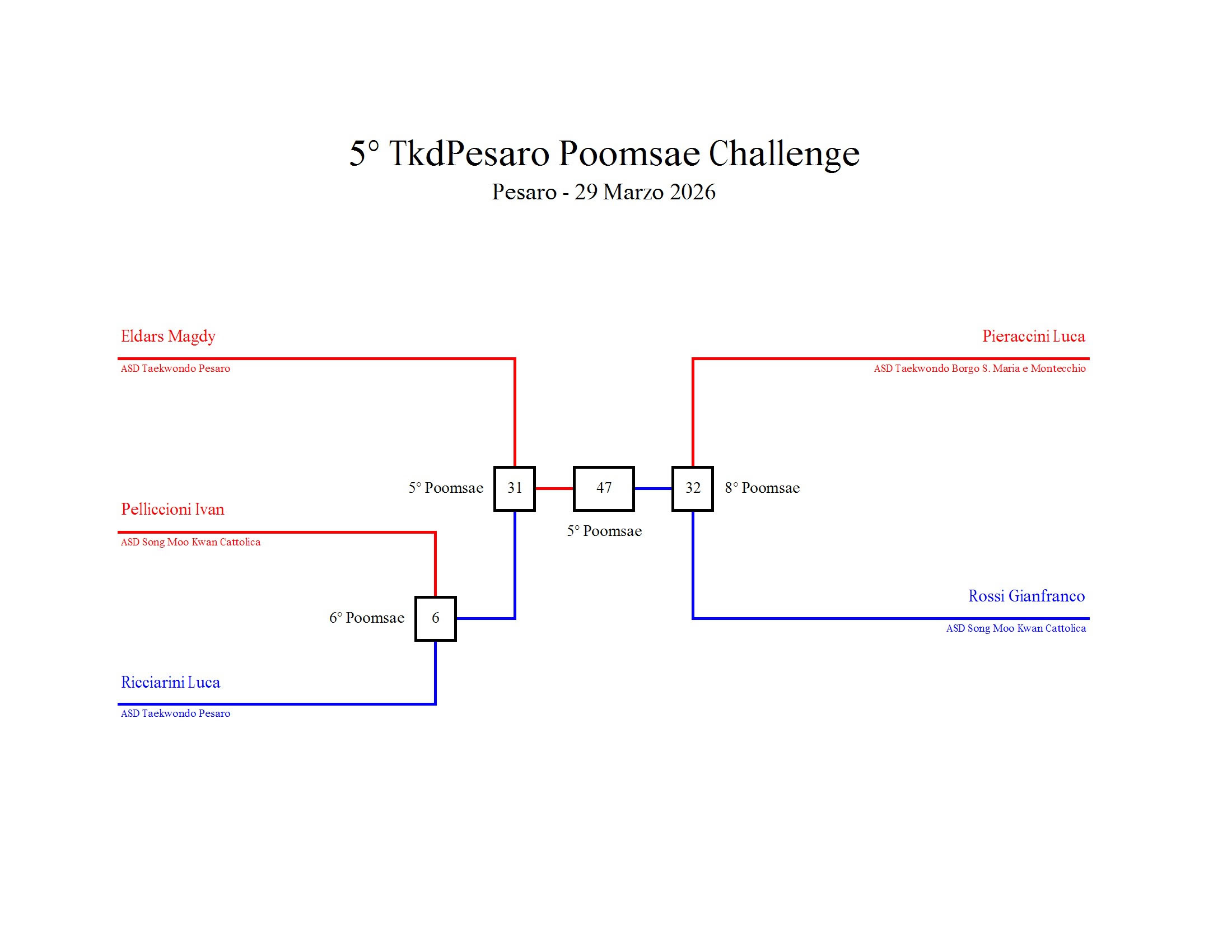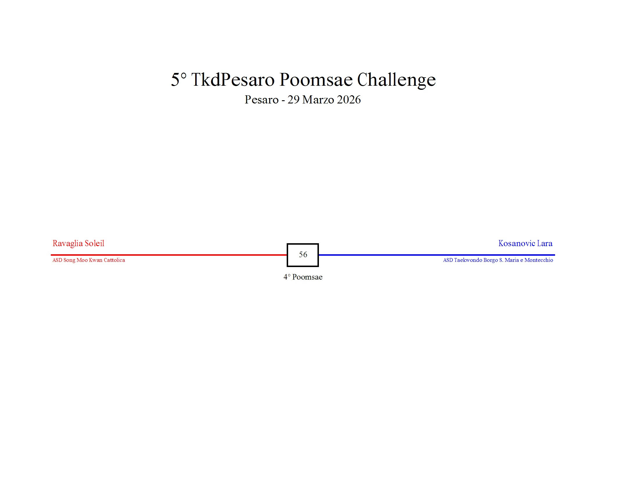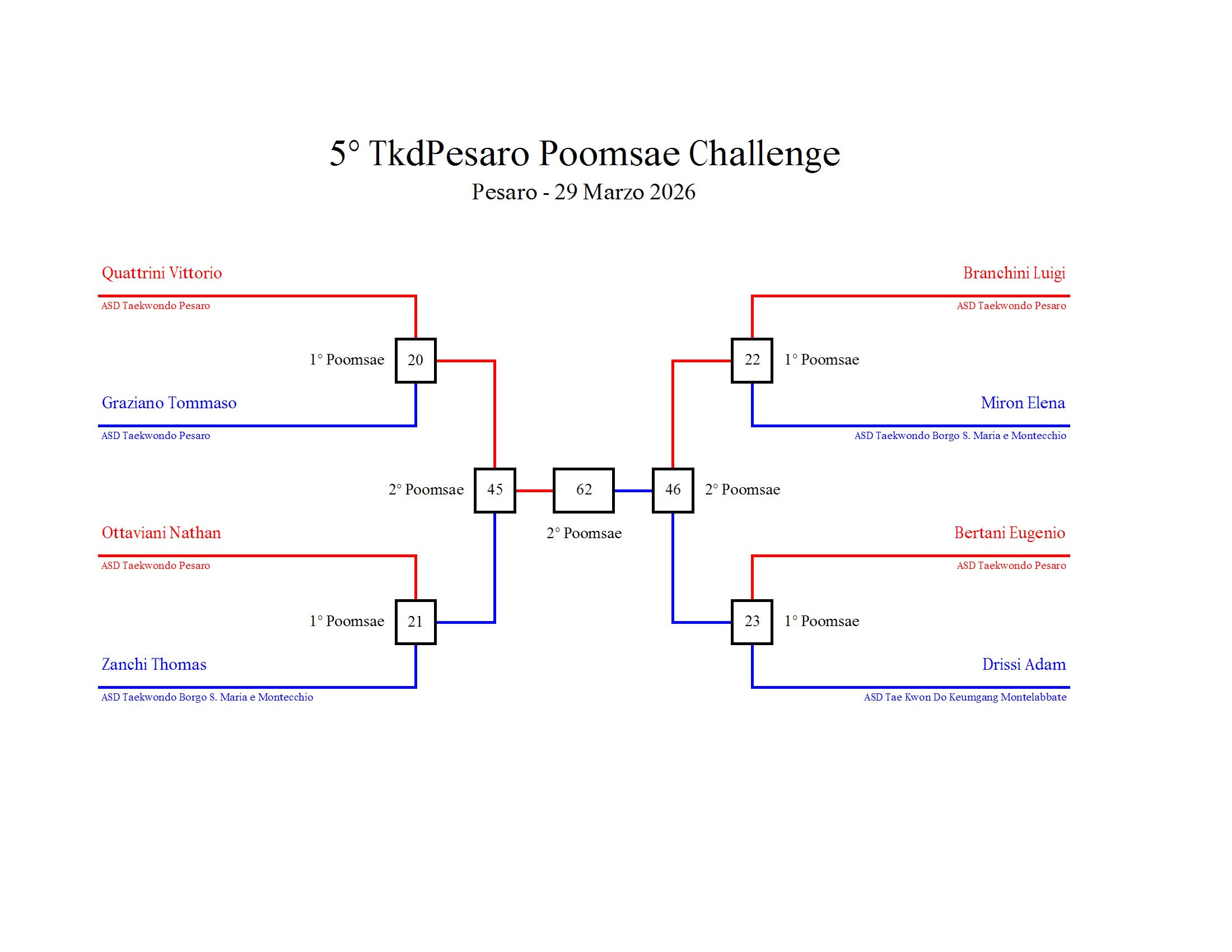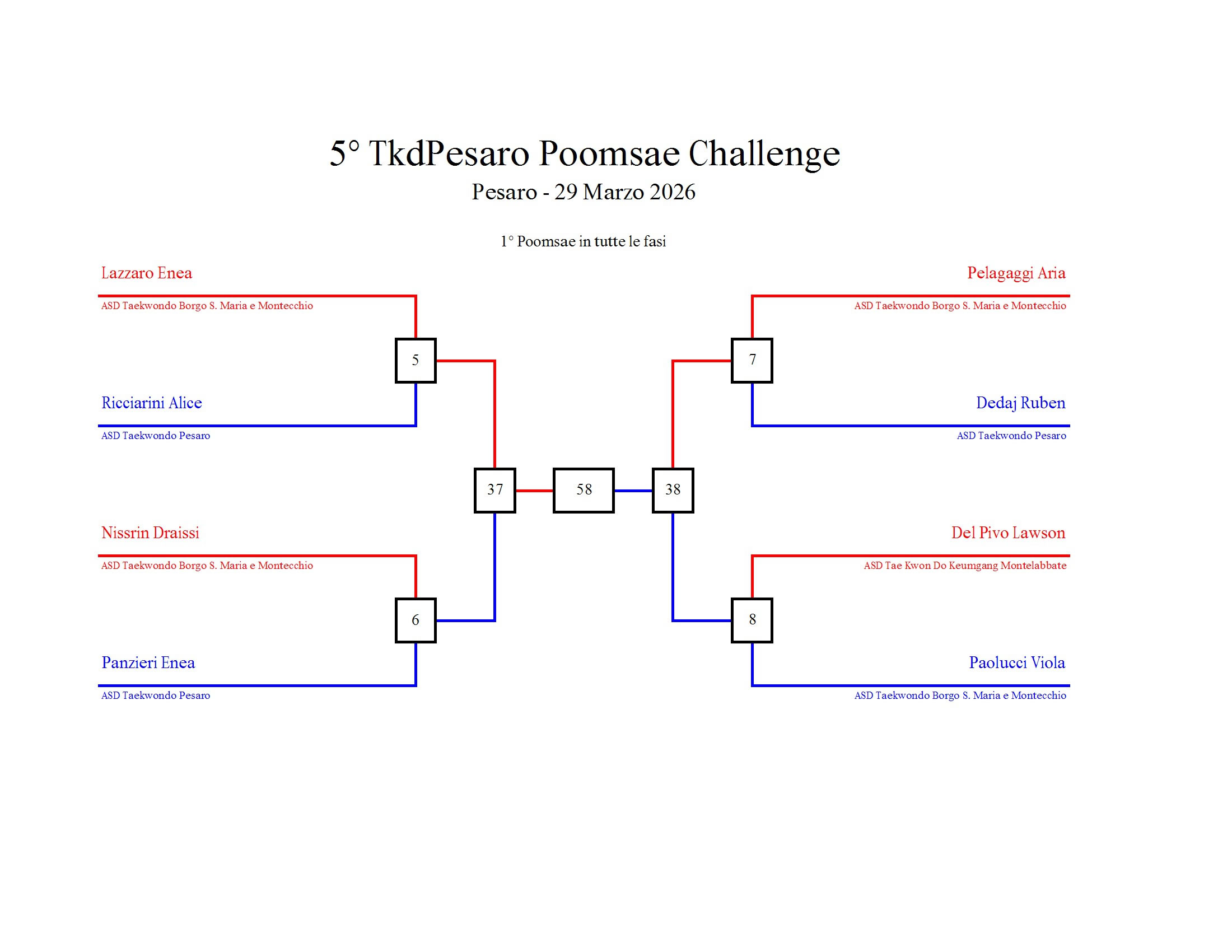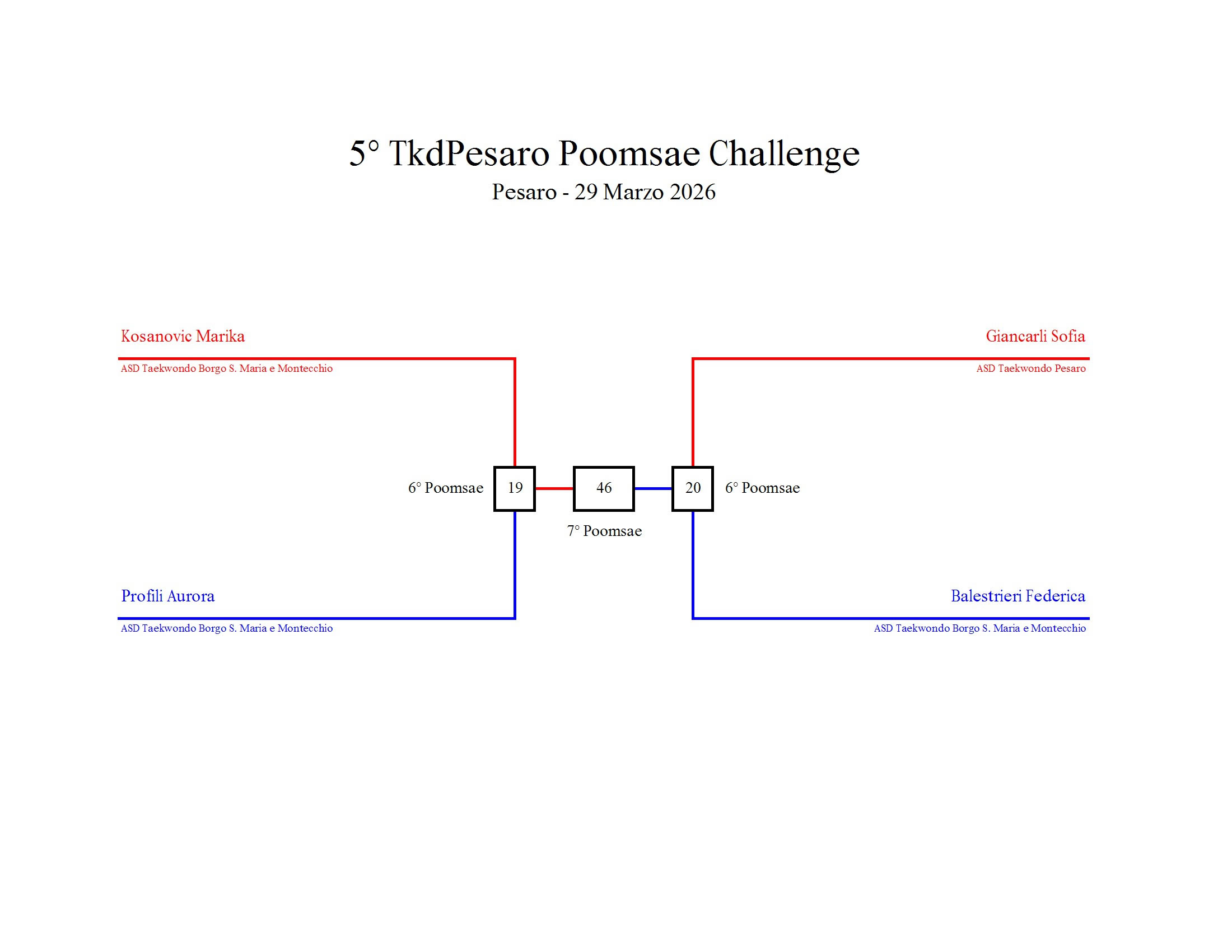 - La sfida sarà diretta e in contemporanea, quindi si esibirà l’allievo 1 assieme all’allievo 2 eseguendo la stessa poomsae in contemporanea, chi vince sfiderà il vincitore dell’altro round; si eseguirà una forma per ogni round