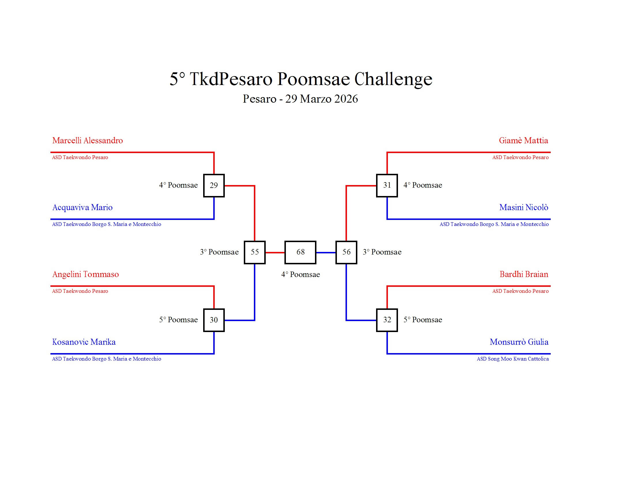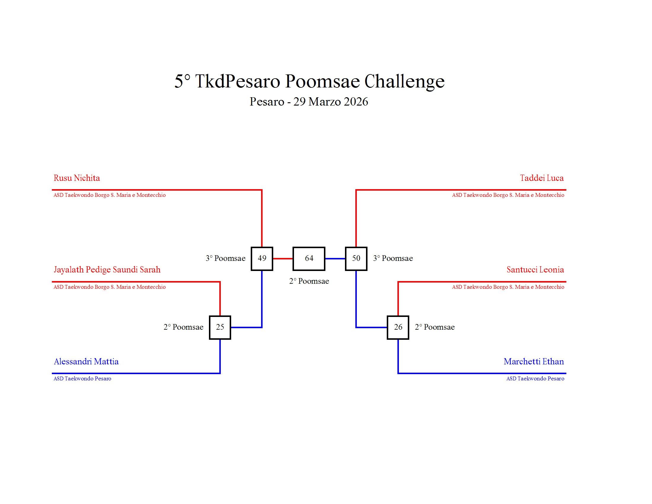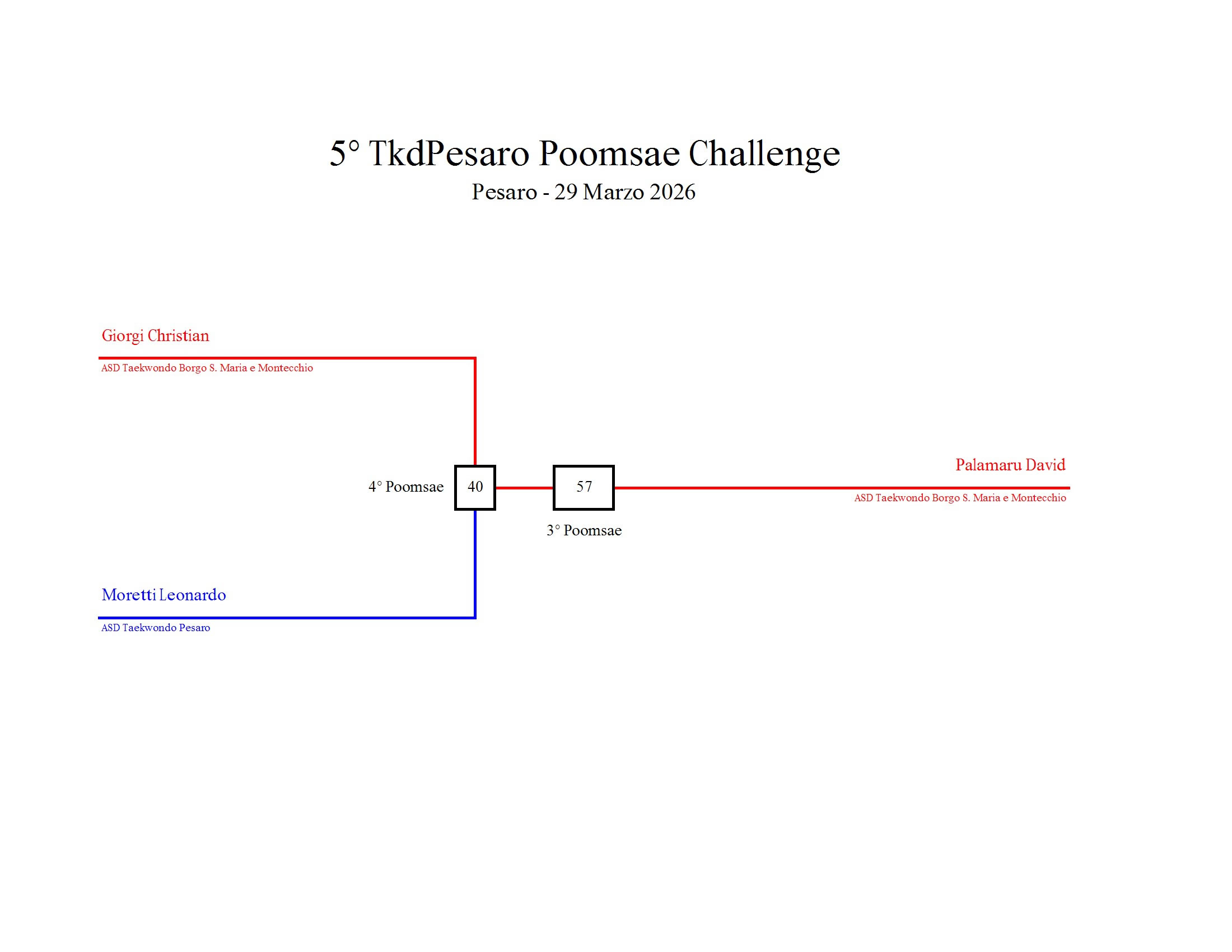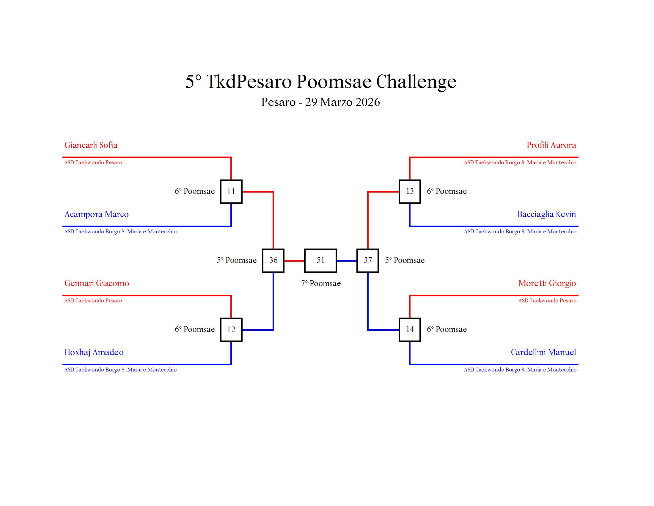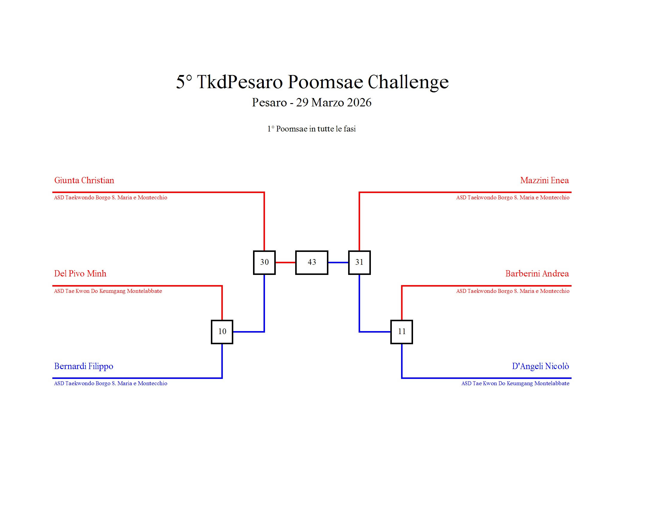 - La sfida sarà diretta e in contemporanea, quindi si esibirà l’allievo 1 assieme all’allievo 2 eseguendo la stessa poomsae in contemporanea, chi vince sfiderà il vincitore dell’altro round; si eseguirà una forma per ogni round