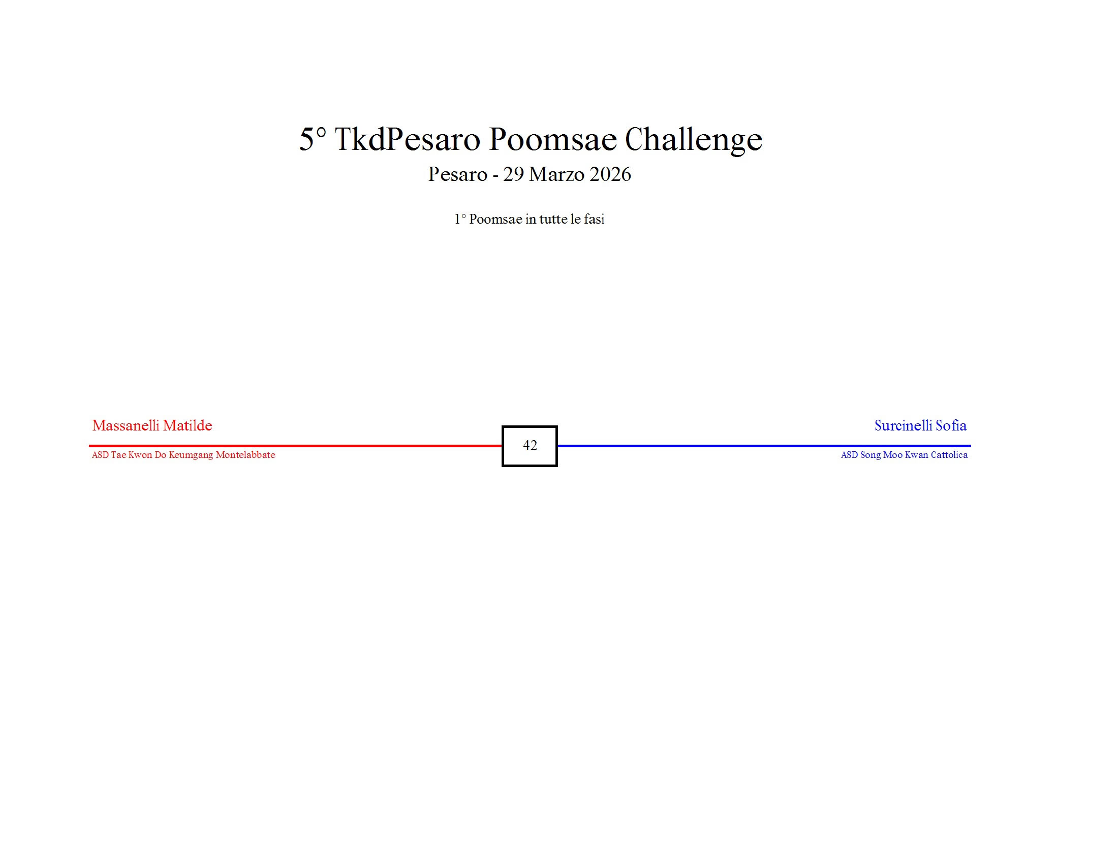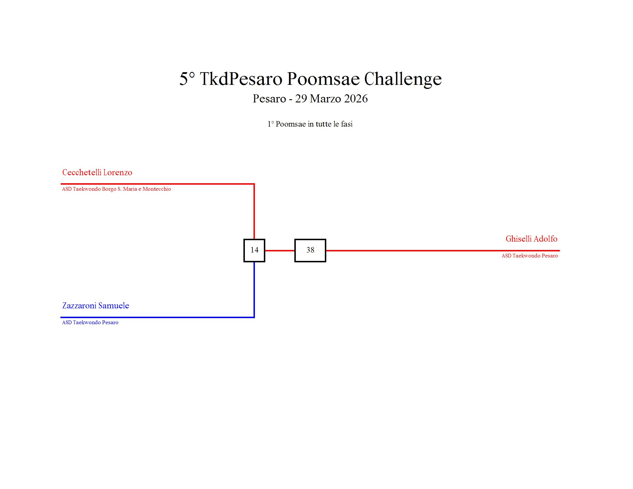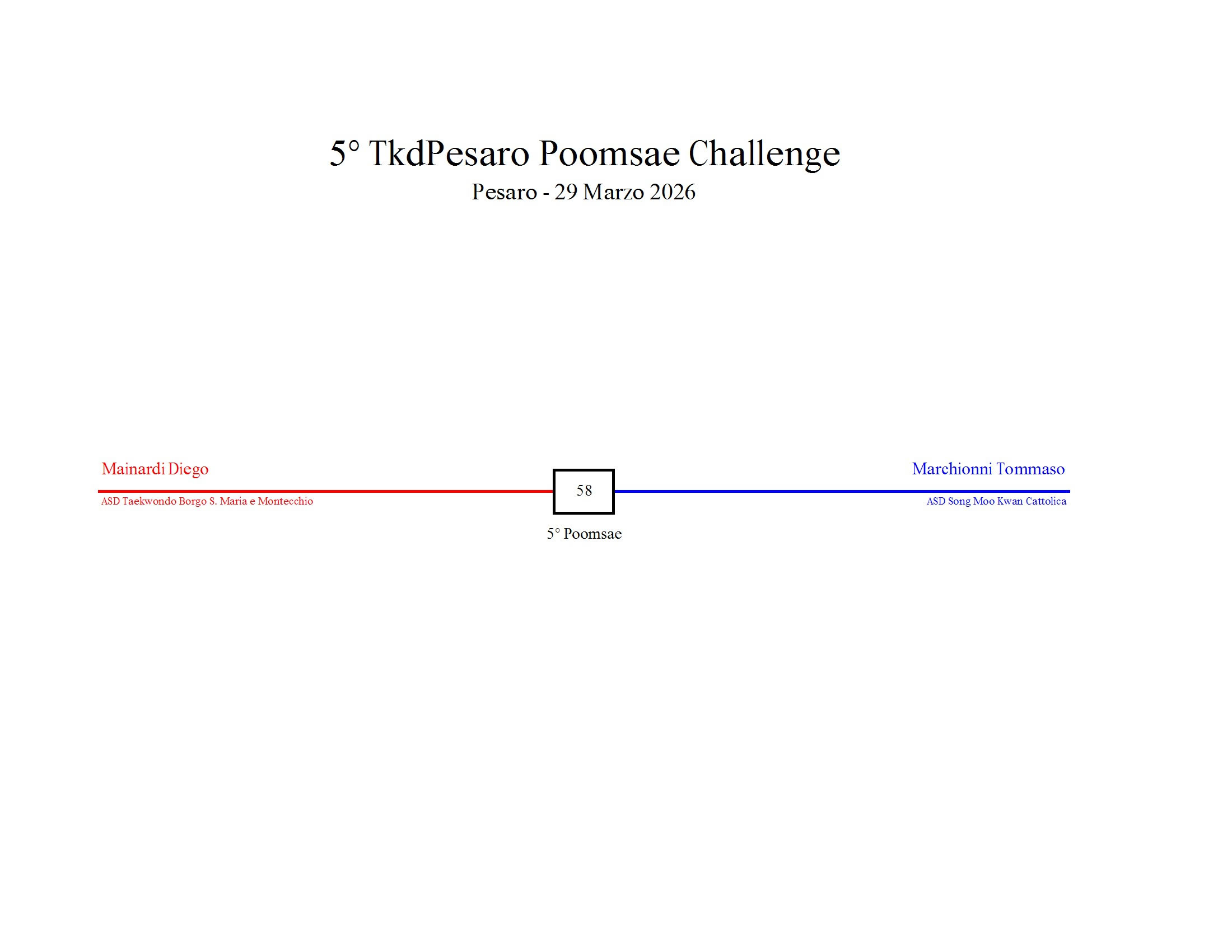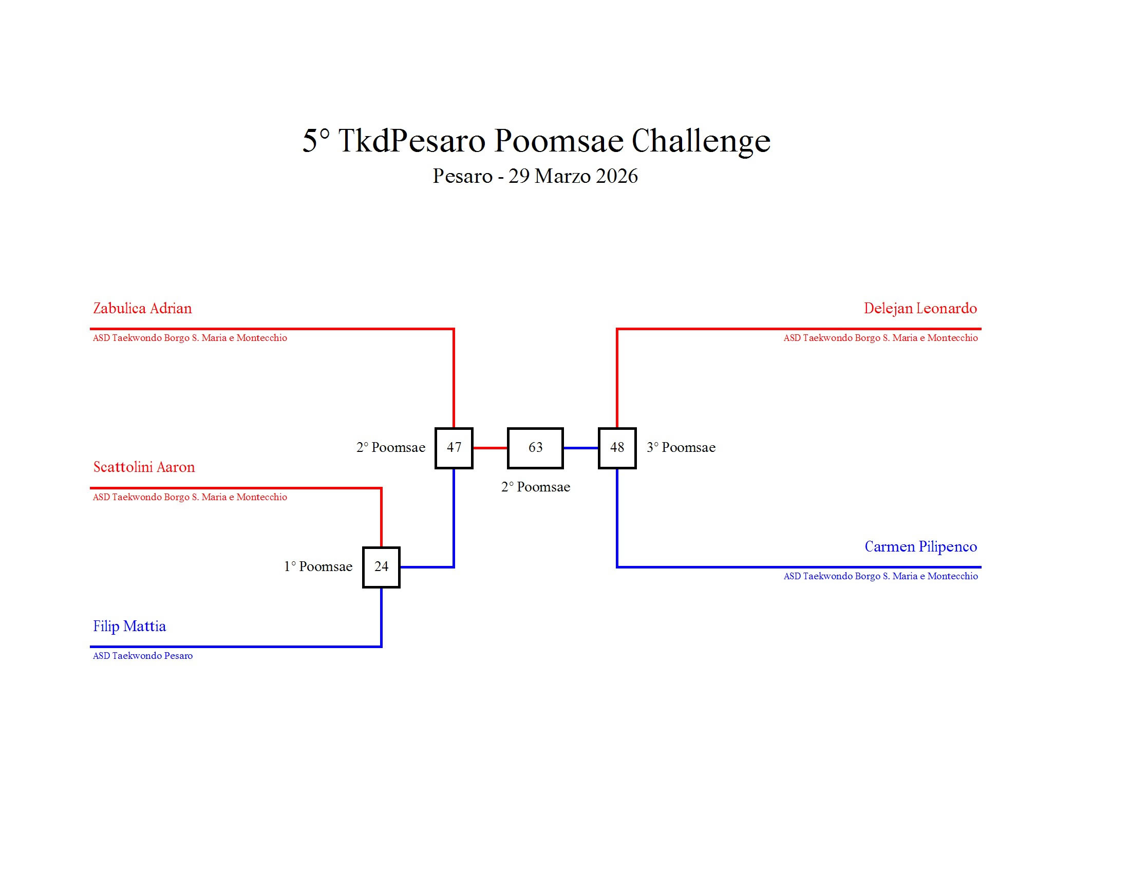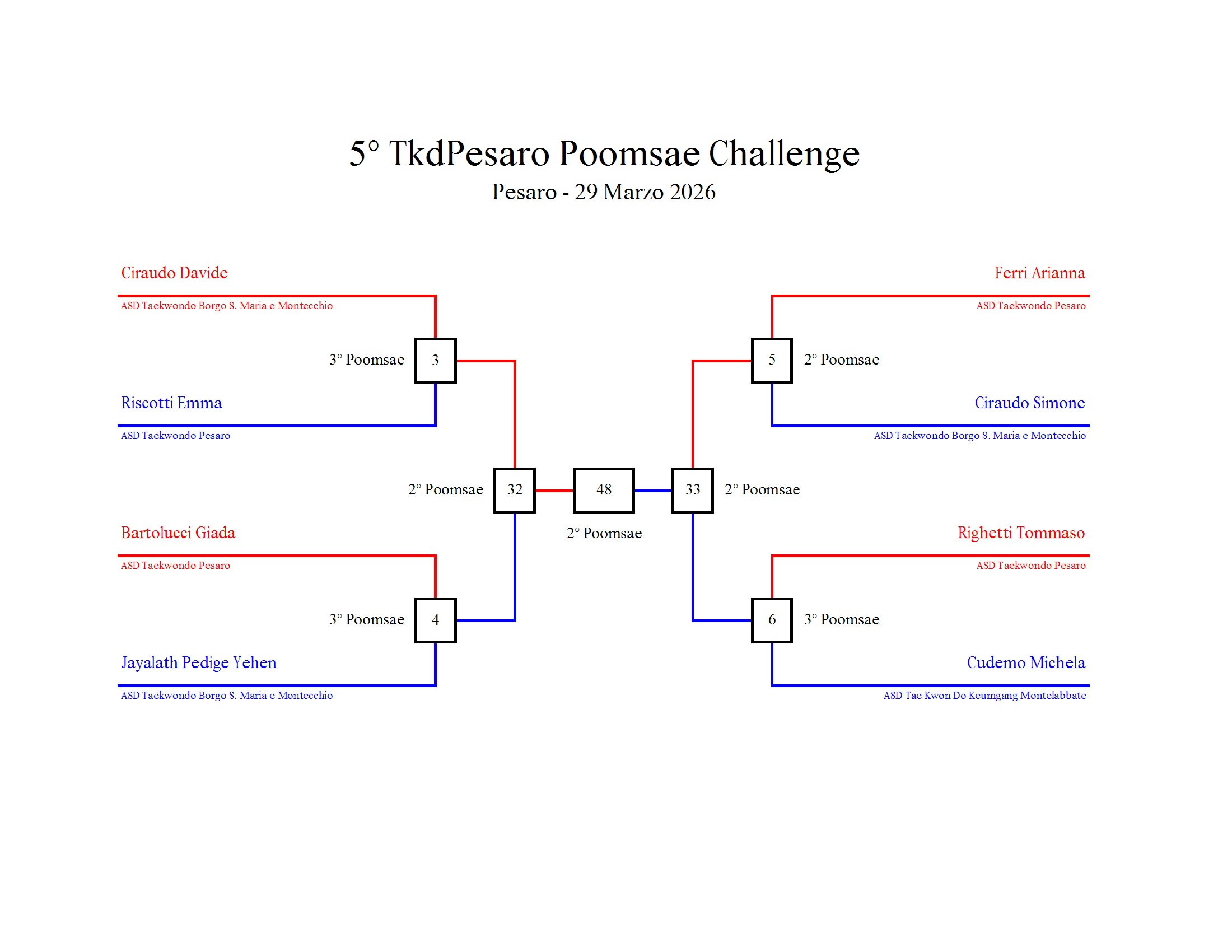 - La sfida sarà diretta e in contemporanea, quindi si esibirà l’allievo 1 assieme all’allievo 2 eseguendo la stessa poomsae in contemporanea, chi vince sfiderà il vincitore dell’altro round; si eseguirà una forma per ogni round