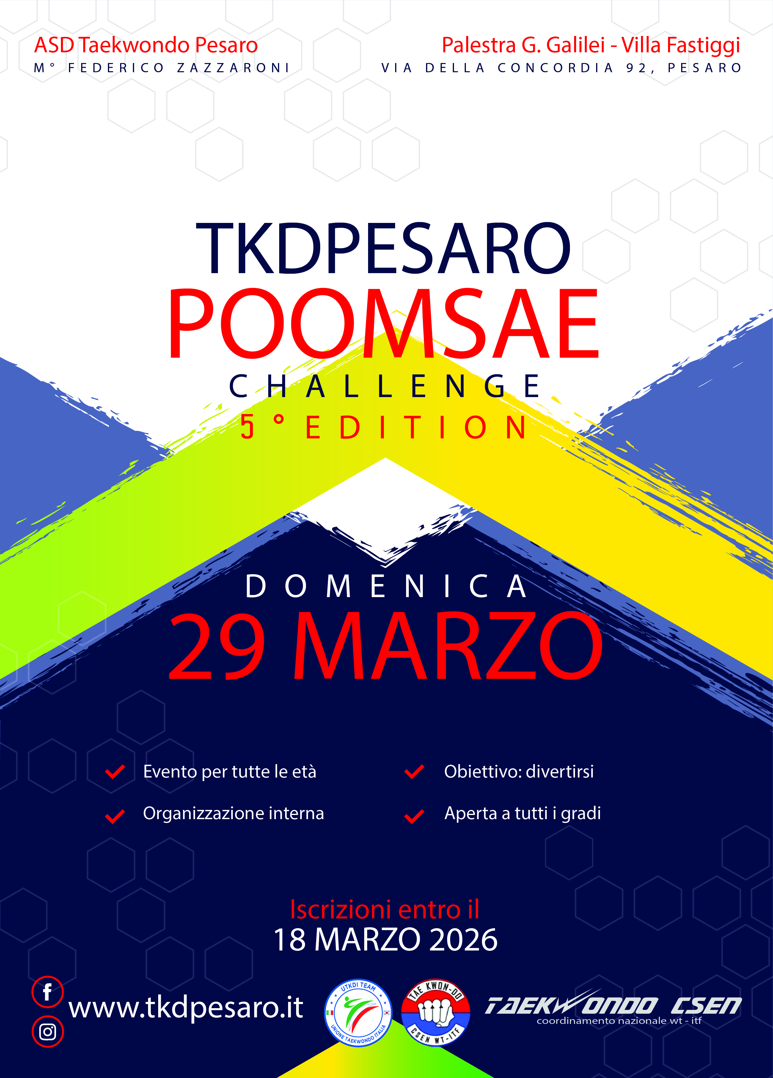 29-03-2026È con grande entusiasmo che la nostra scuola di Taekwondo ha deciso di organizzare la 5° edizione della TkdPesaro Poomsae Challenge!