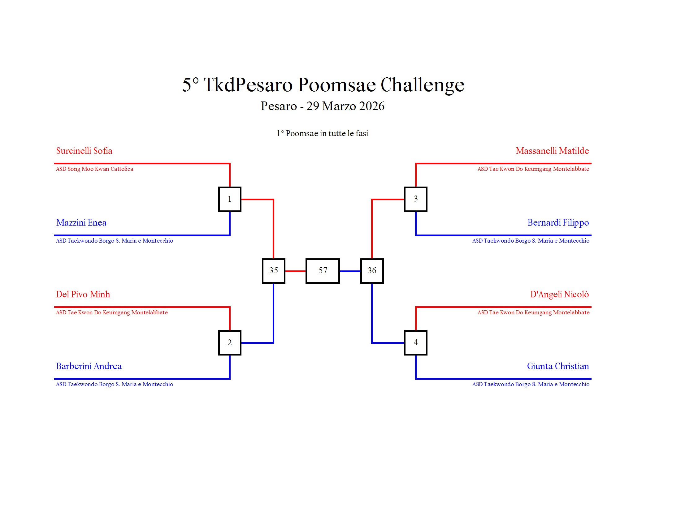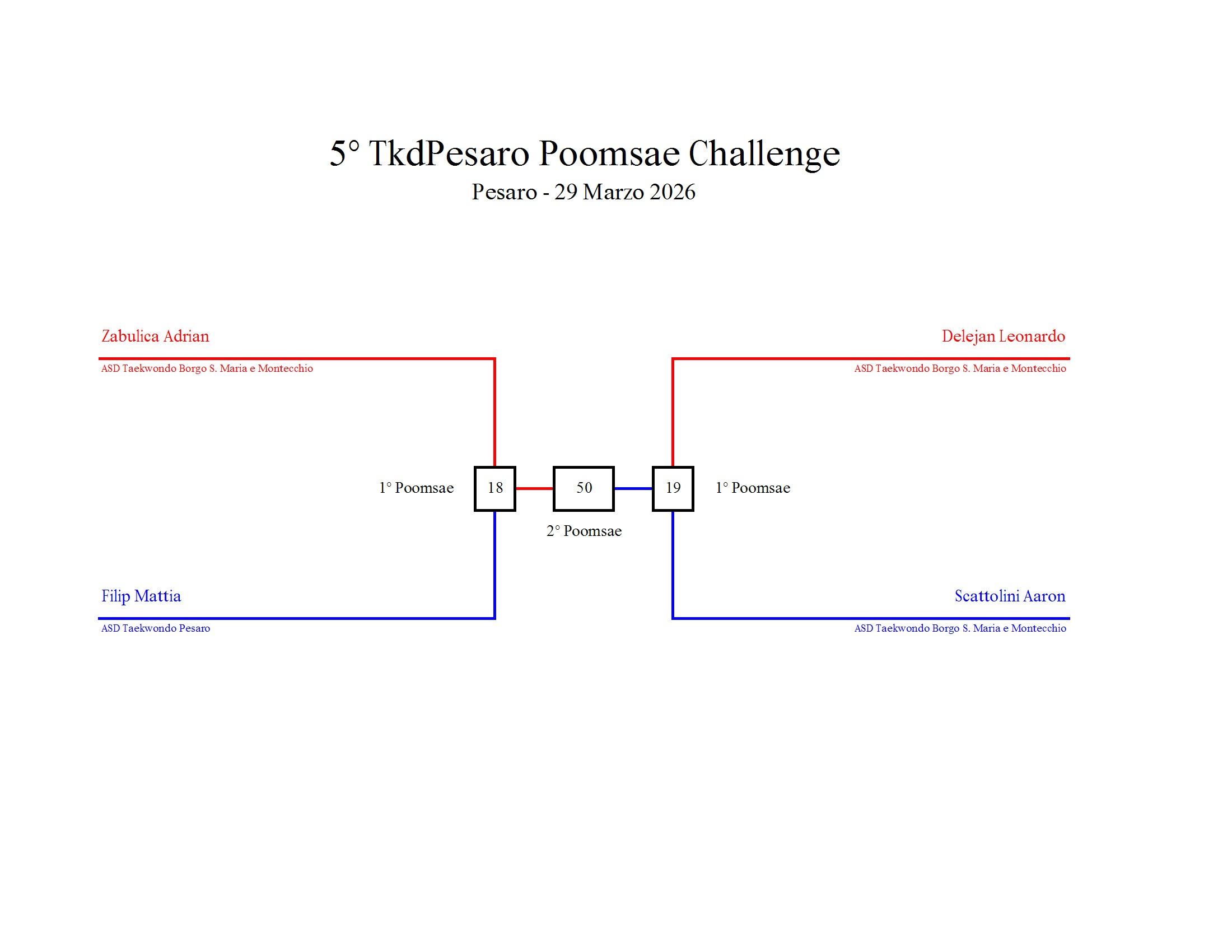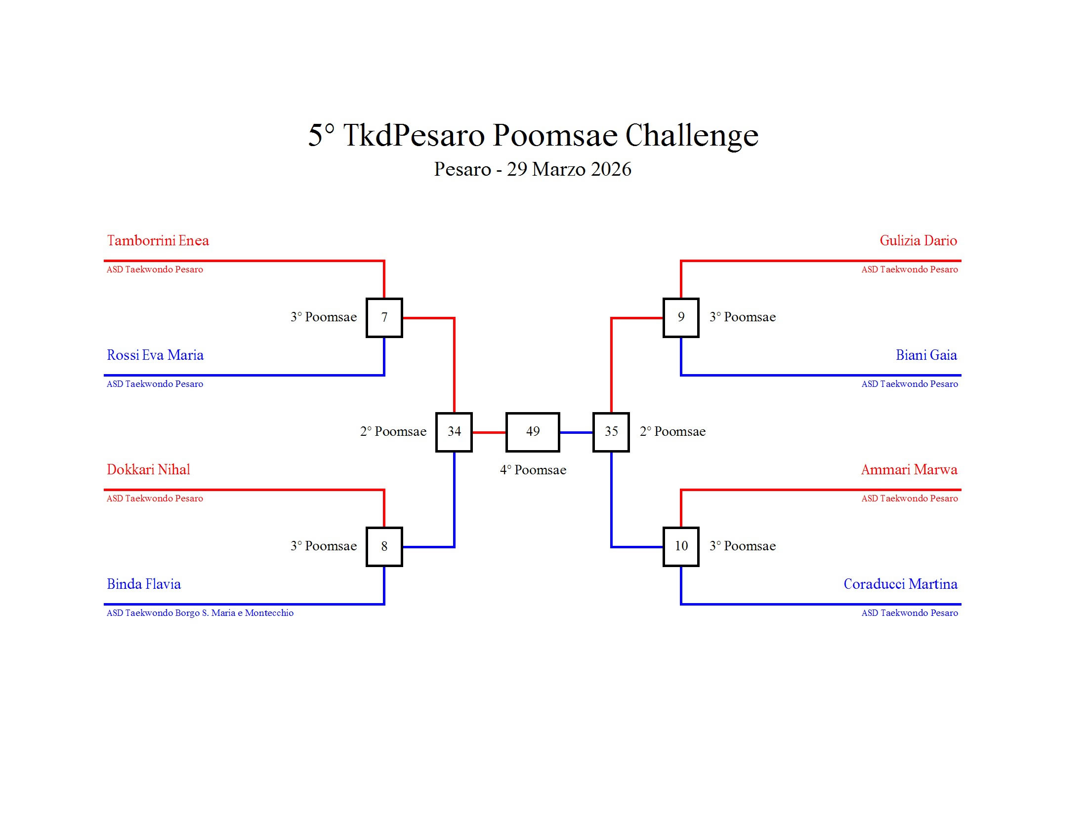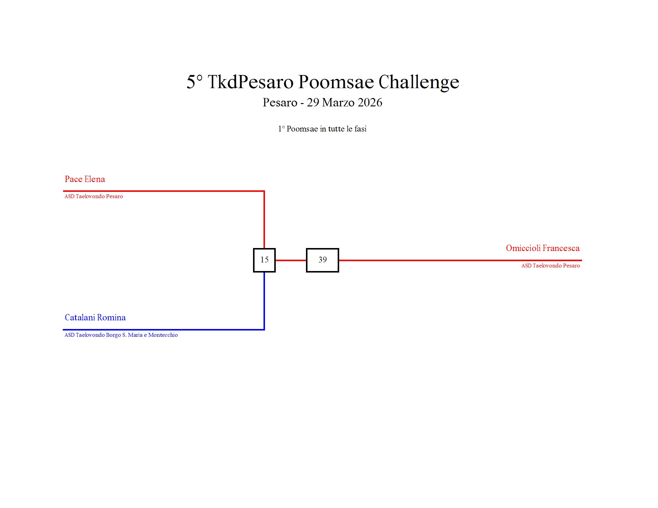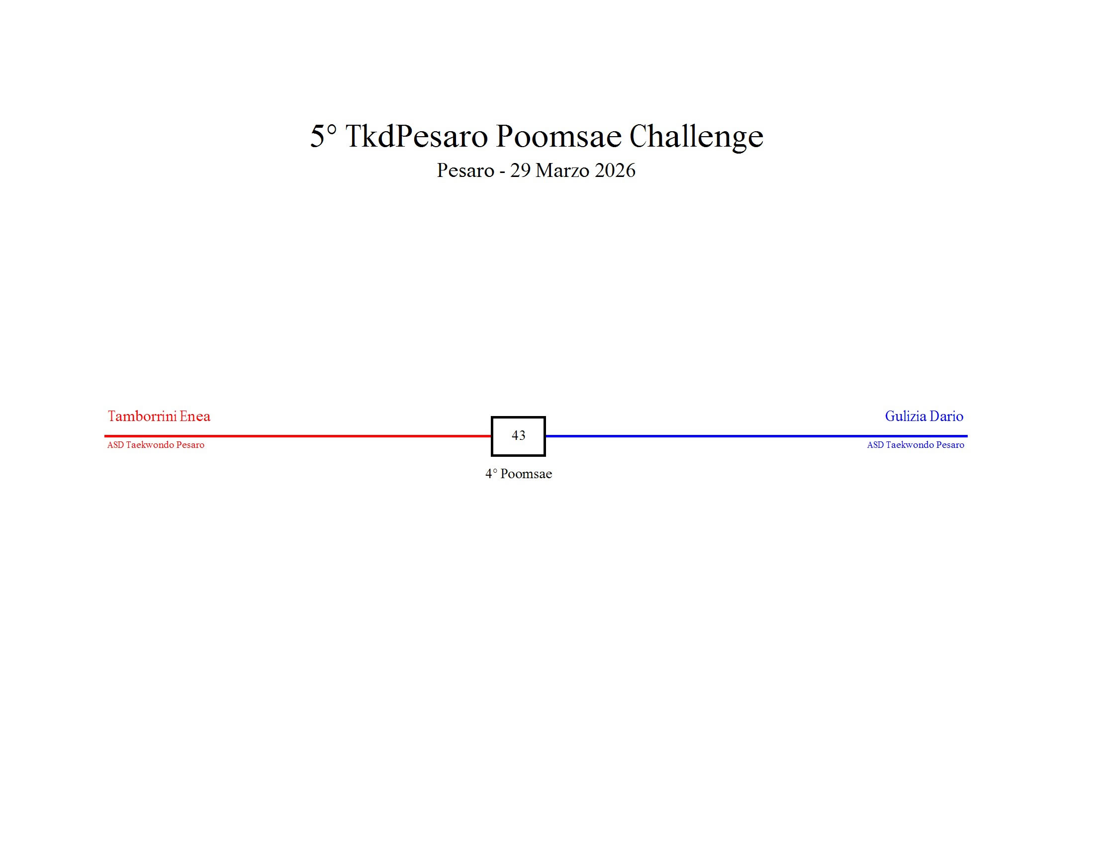 - La sfida sarà diretta e in contemporanea, quindi si esibirà l’allievo 1 assieme all’allievo 2 eseguendo la stessa poomsae in contemporanea, chi vince sfiderà il vincitore dell’altro round; si eseguirà una forma per ogni round