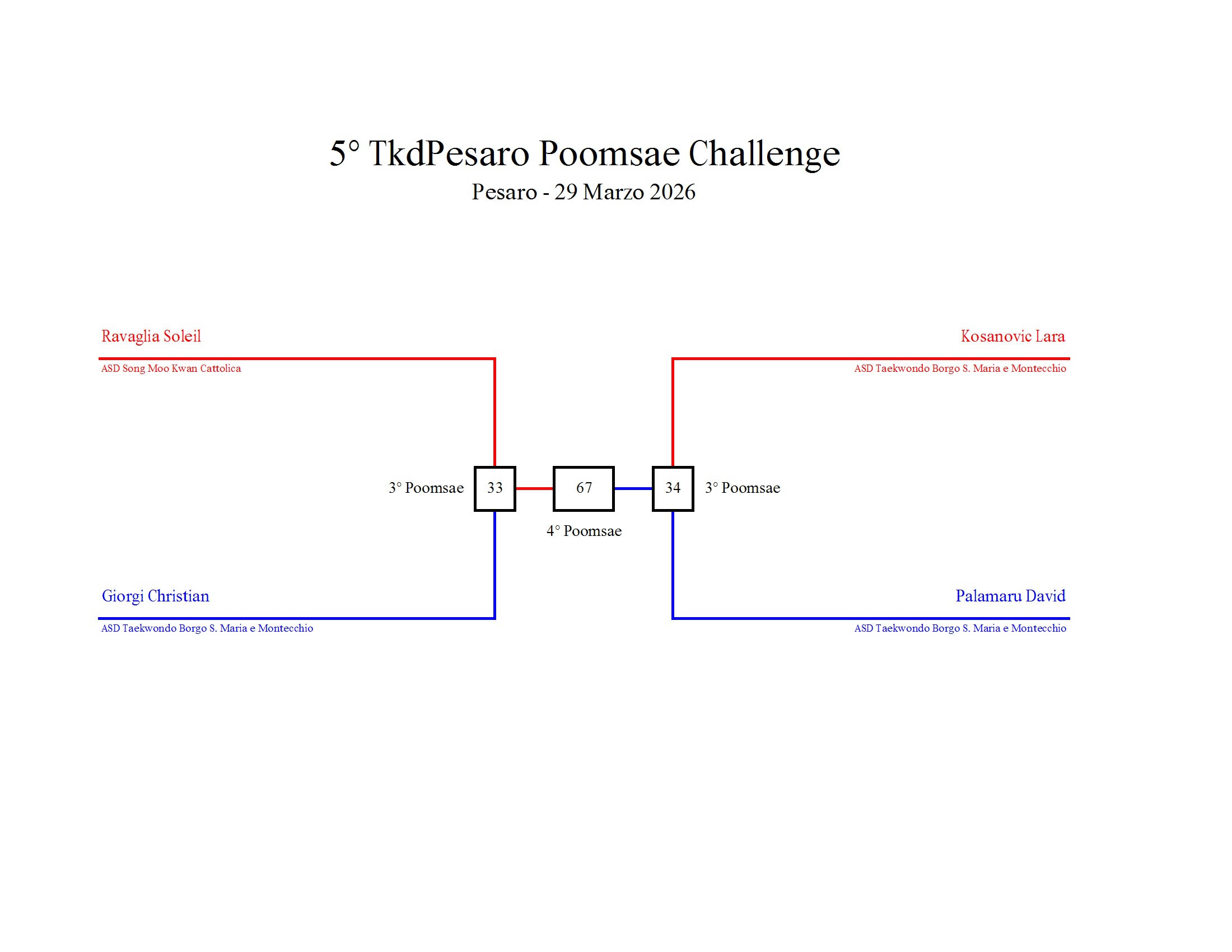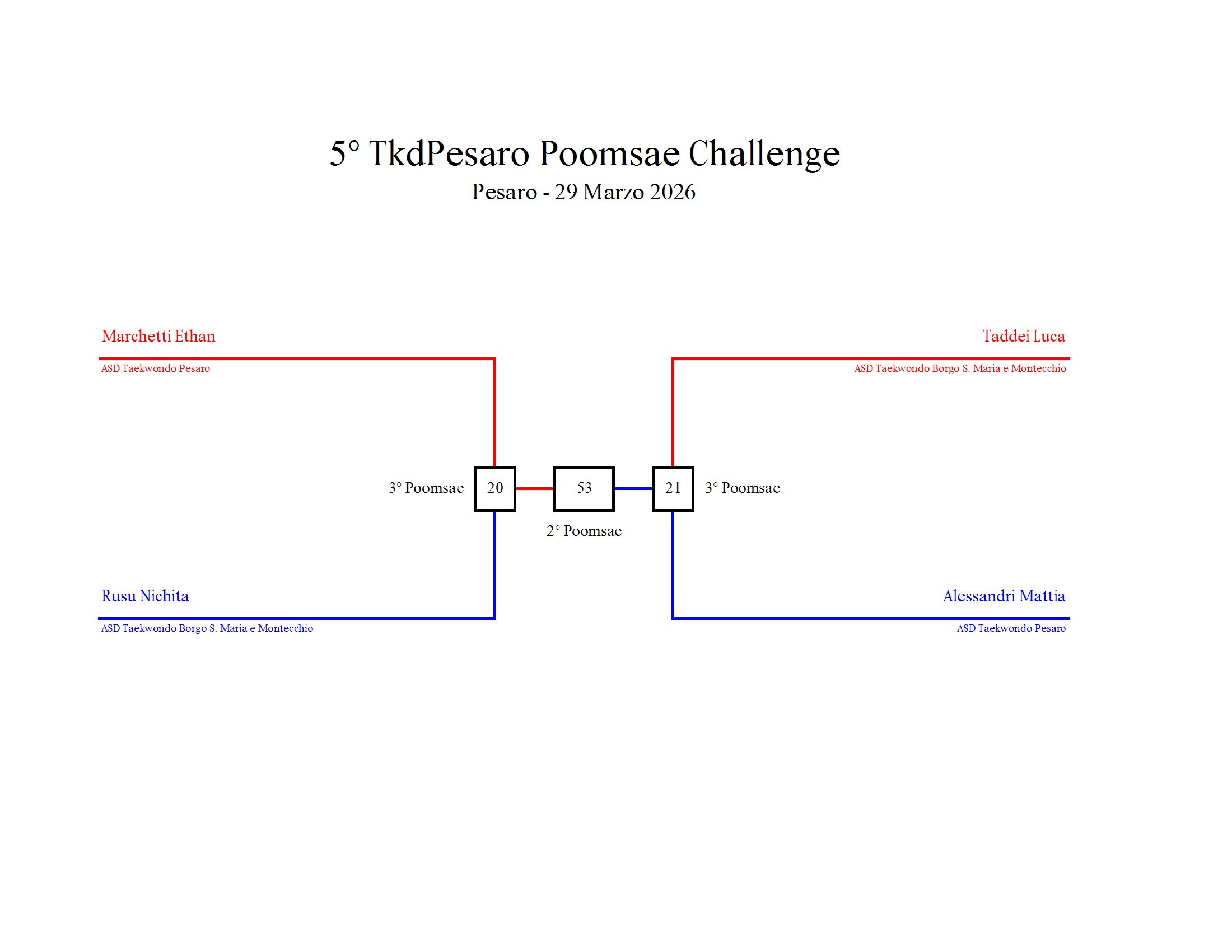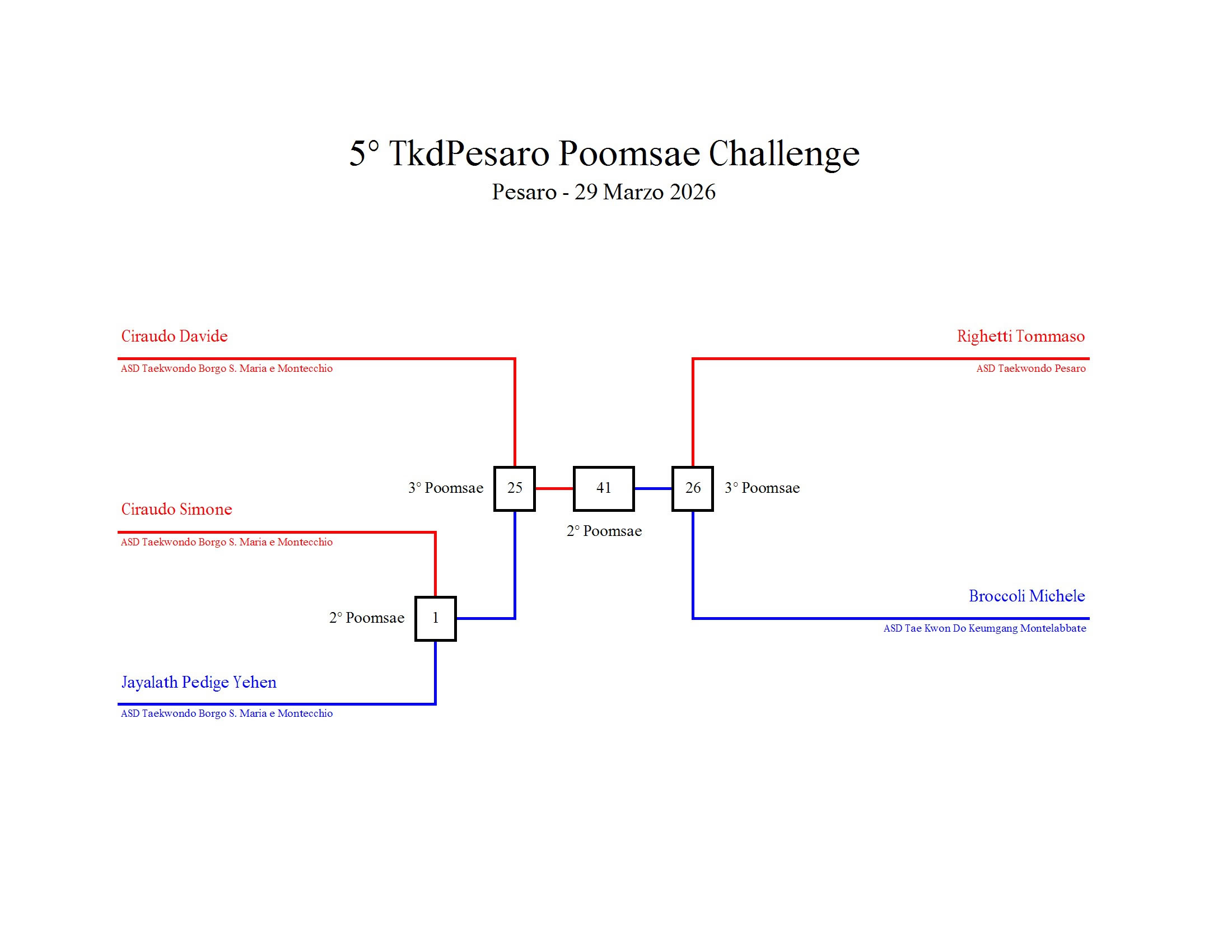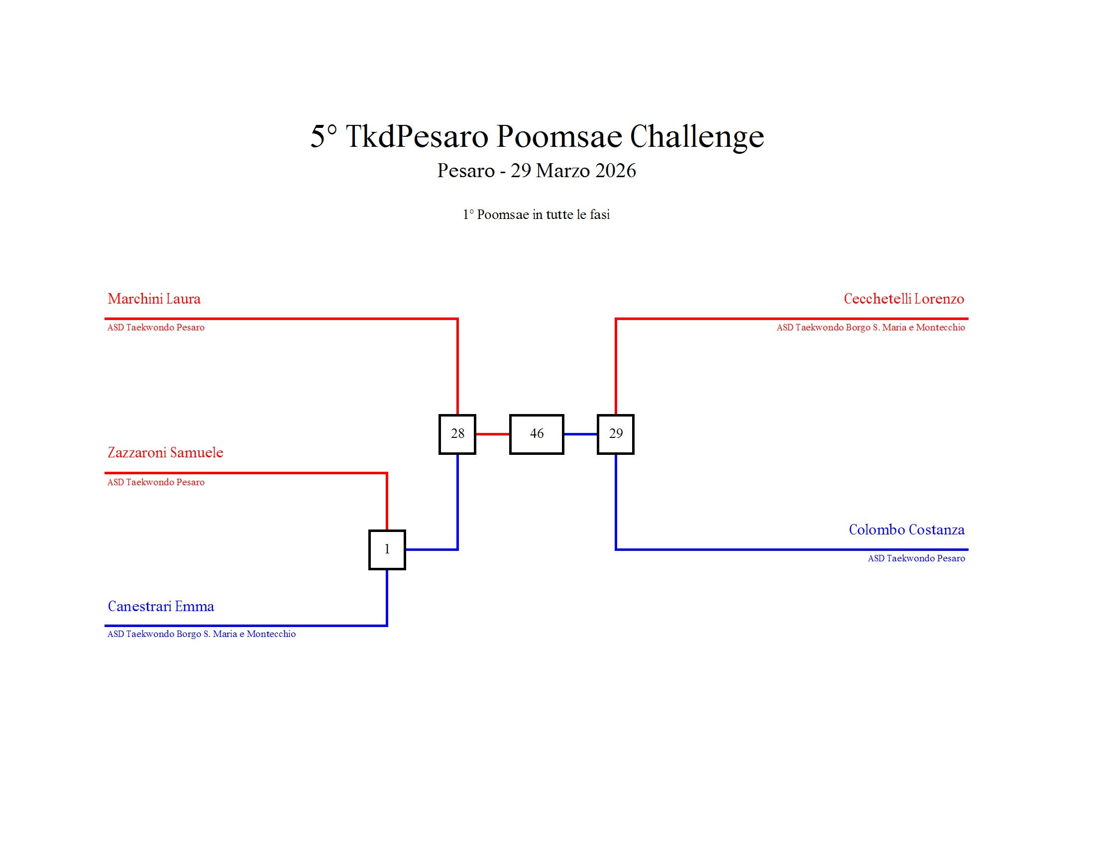- La sfida sarà diretta e in contemporanea, quindi si esibirà l’allievo 1 assieme all’allievo 2 eseguendo la stessa poomsae in contemporanea, chi vince sfiderà il vincitore dell’altro round; si eseguirà una forma per ogni round
