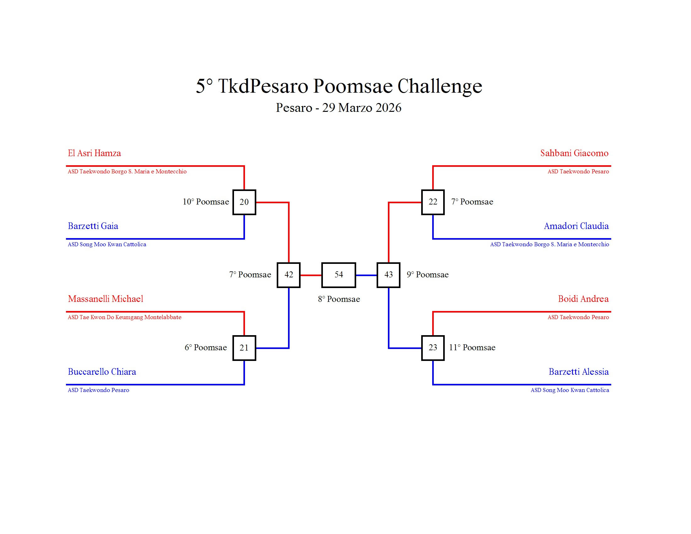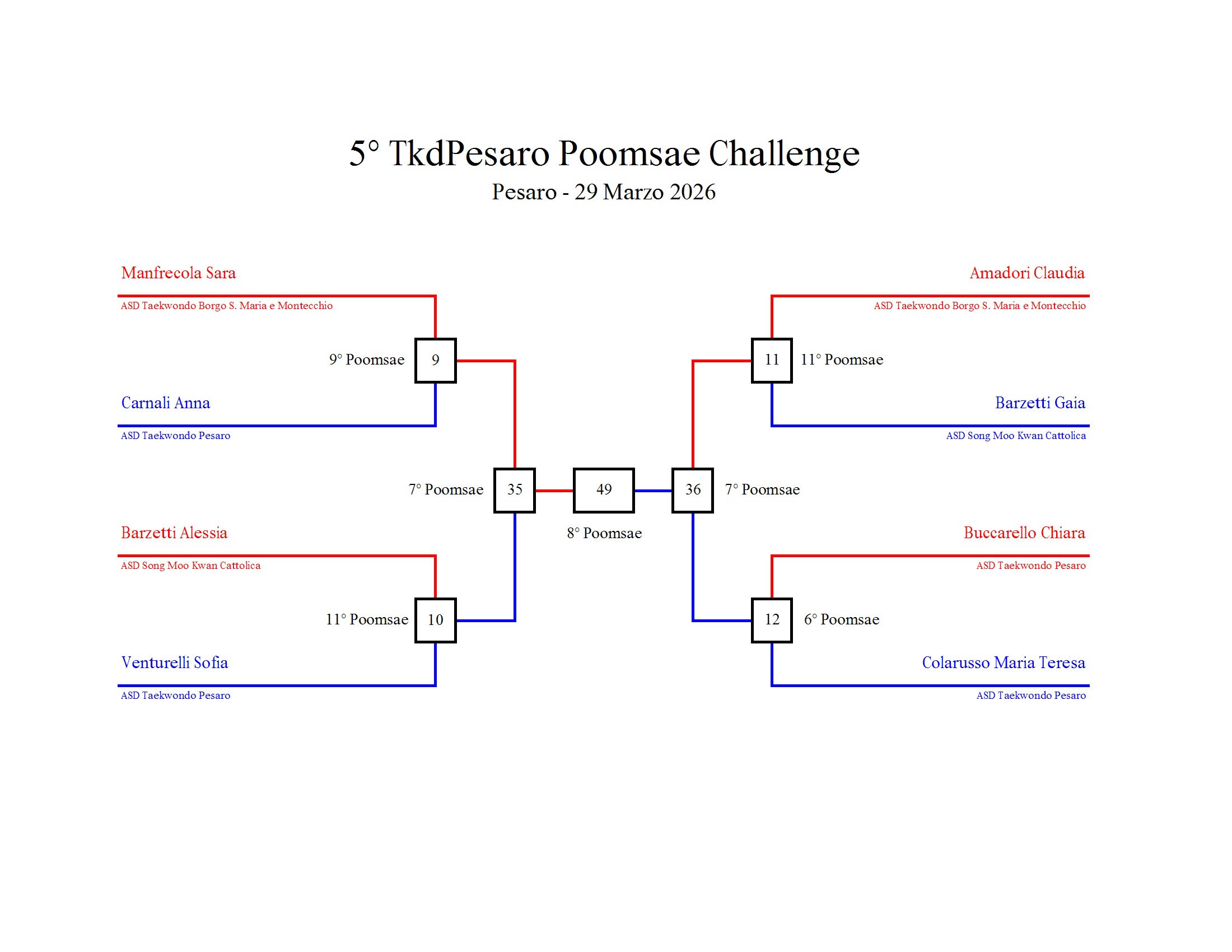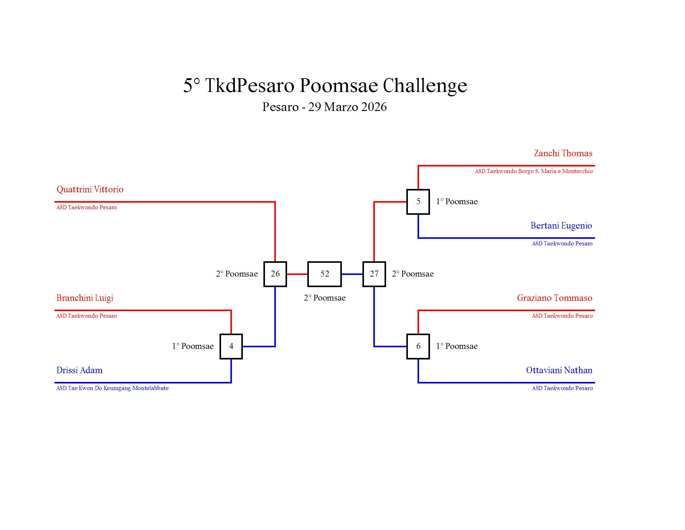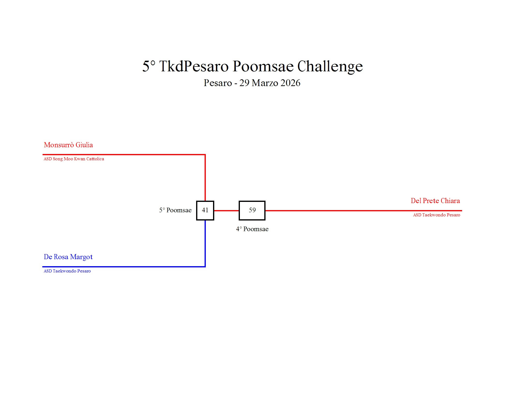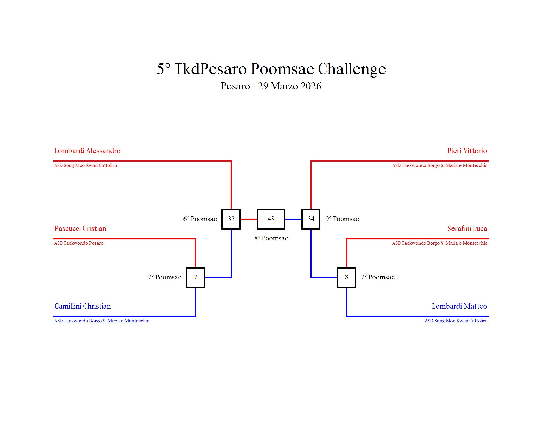 - La sfida sarà diretta e in contemporanea, quindi si esibirà l’allievo 1 assieme all’allievo 2 eseguendo la stessa poomsae in contemporanea, chi vince sfiderà il vincitore dell’altro round; si eseguirà una forma per ogni round