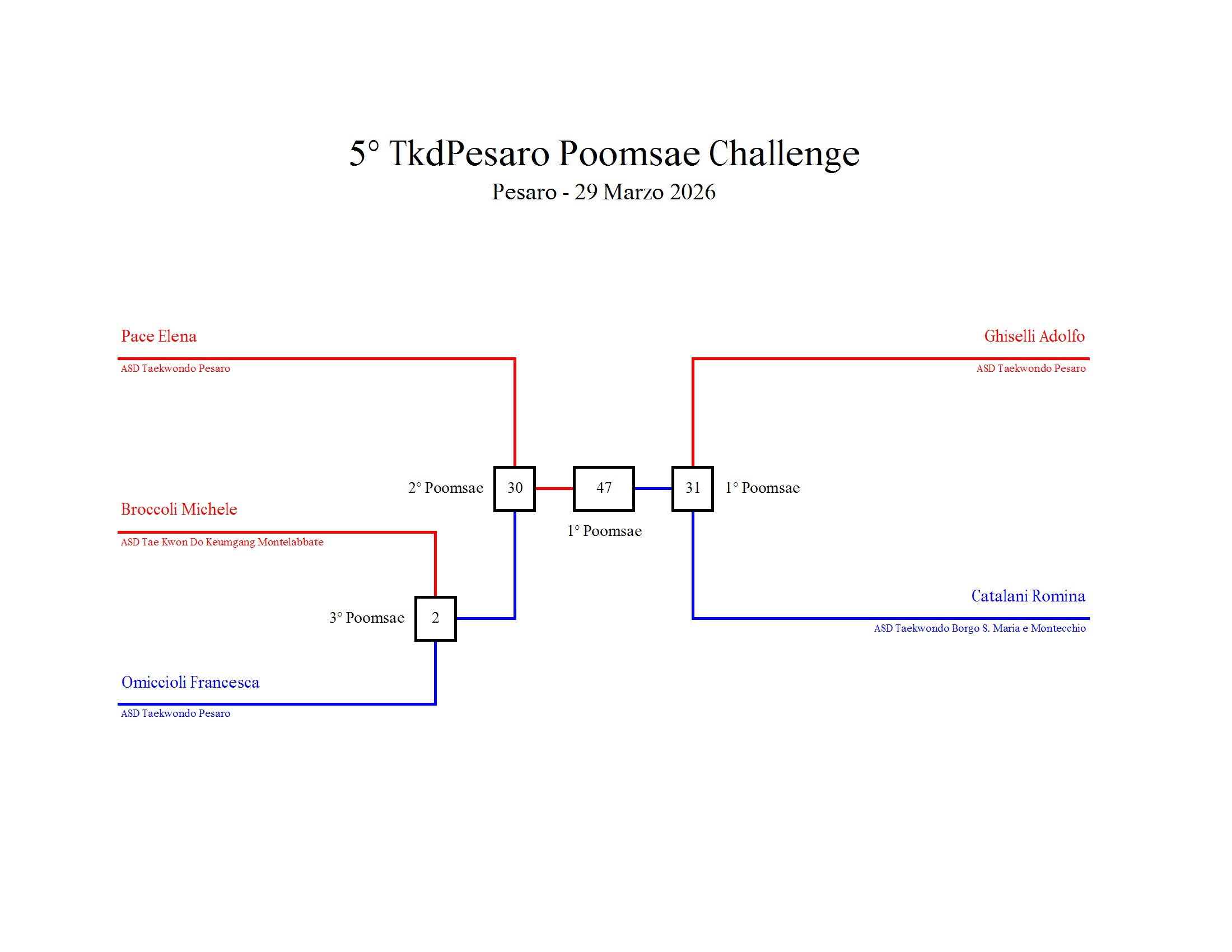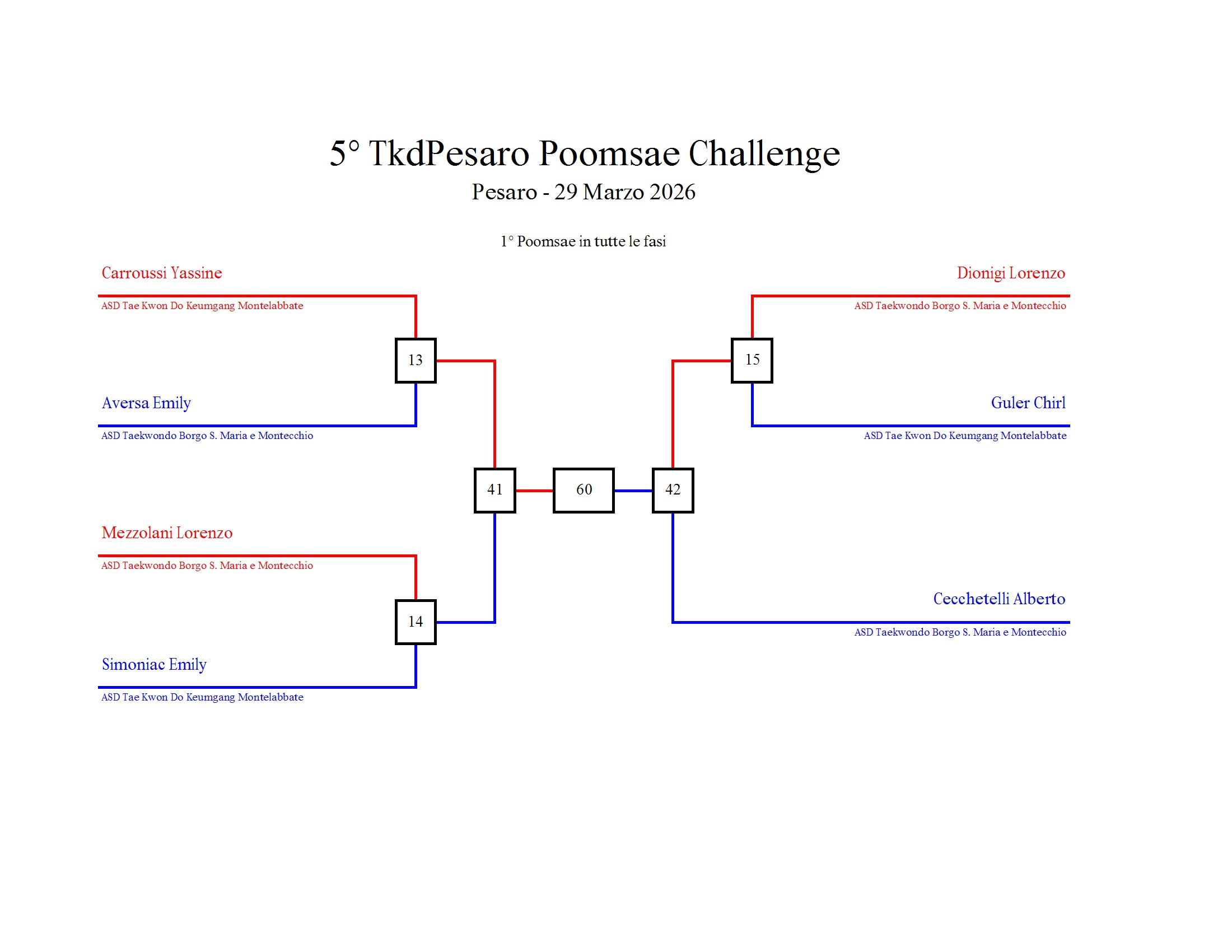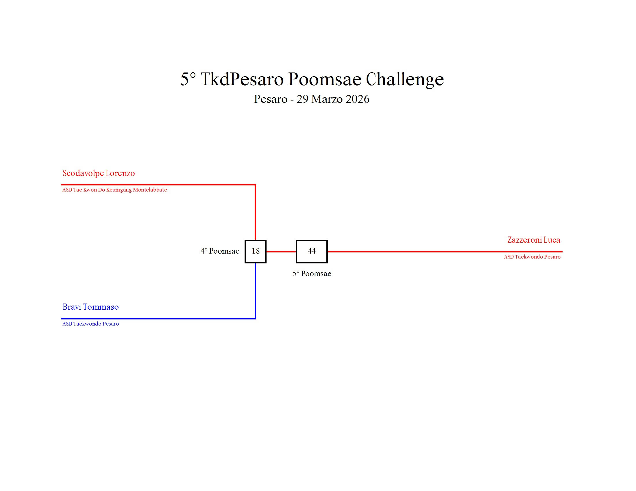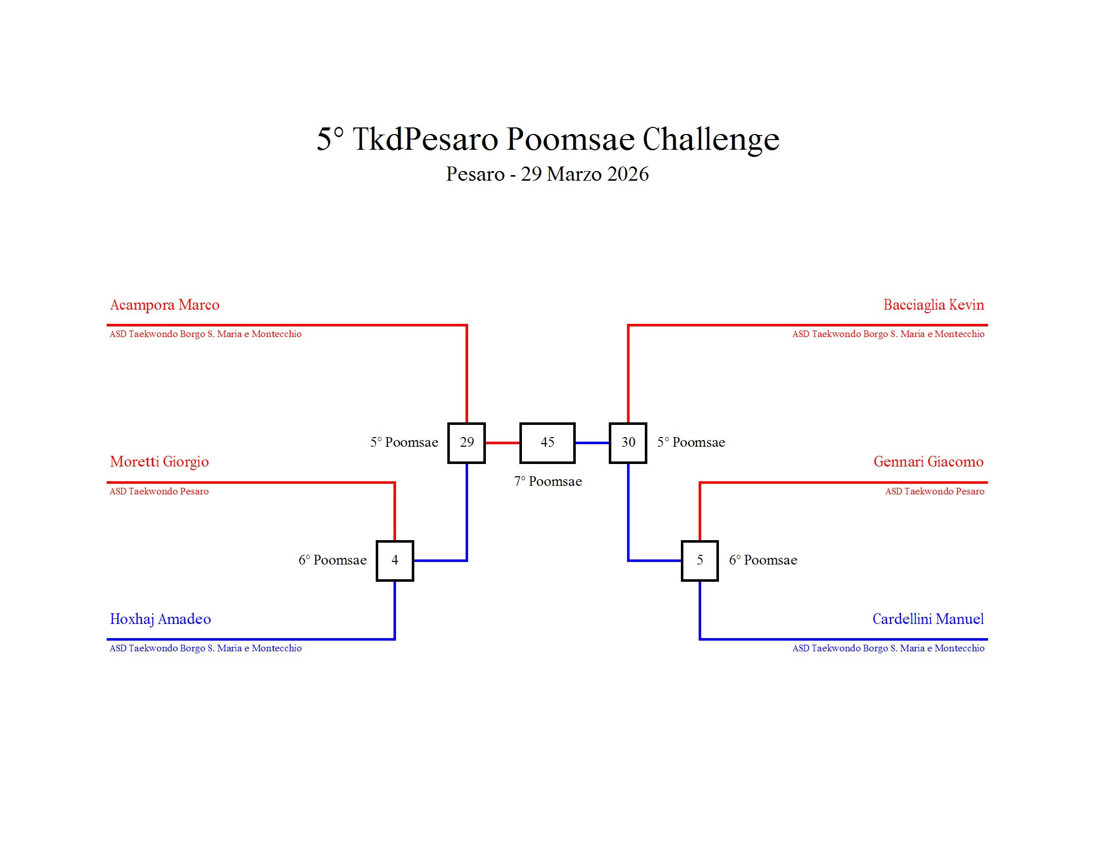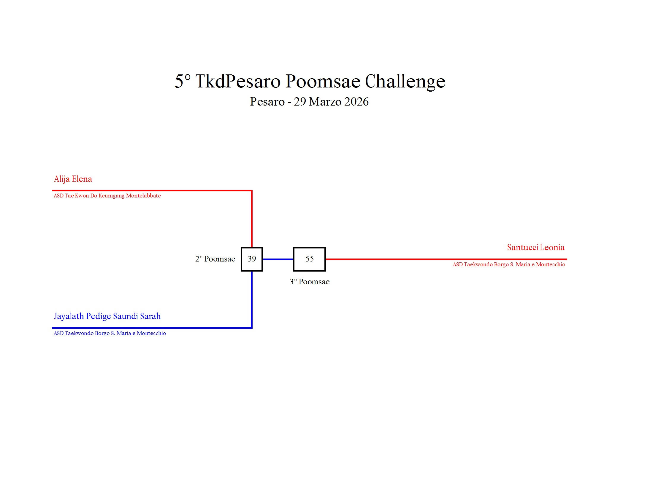 - La sfida sarà diretta e in contemporanea, quindi si esibirà l’allievo 1 assieme all’allievo 2 eseguendo la stessa poomsae in contemporanea, chi vince sfiderà il vincitore dell’altro round; si eseguirà una forma per ogni round